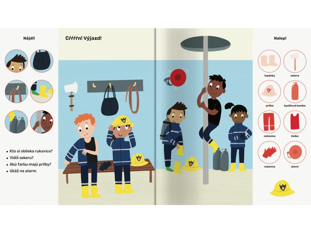 Nič nebaví deti tak ako hľadanie obrázkov a dolepovanie samolepiek na stránky pracovného zošita. V tomto zošite si takéto aktivity užijú do sýtosti - čaká ich totiž viac ako 101 obrázkov. Niektoré budú najprv hľadať, ďalšie potom nalepia. Na každej dvojstrane objavia hasičskú stanicu, záchranu počas povodní, hasenie lesného požiaru či záchranu mačky zo stromu. Pri plnení úloh a zodpovedaní otázok sa deti naučia, ako sa čo nazýva. Pomocou dolepovania samolepiek na správne miesto si tiež precvičia jemnú motoriku.