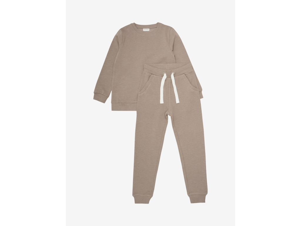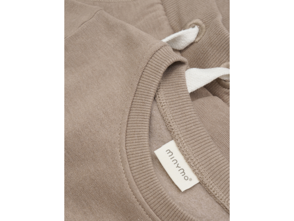Súprava Fine Minymo Sweat pozostávajúca z mikiny a teplákov v melírovo sivej farbe. Mikina má dlhé rukávy a široké rebrované lemy na rukávoch, krku a spodku mikiny. Nohavice majú tiež rebrované spodky, široku gumu v páse a dajú sa stiahnuť bielou šnúrkou. Vpredu sú praktické vrecká. Mikina aj nohavice majú zvnútra jemnú, brúsenú bavlnu.