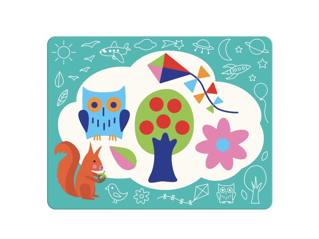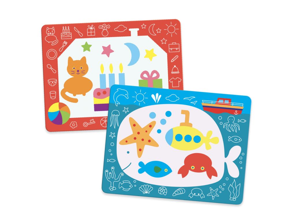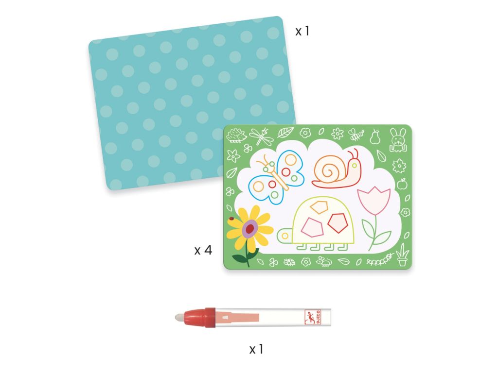 Kreslíme všeličo od hviezdy po hviezdicu, od šarkana po ponorku. Opakovane použiteľná malá kreatívna sada 4 obrázkov na magické vyfarbovanie vodou je ideálna na vzbudenie záujmu batoliat o maľovanie a na rozvoj jemnej motoriky. Atraktívne ilustrované obrázky z ohybného plastu majú špeciálne biele plôšky. Po pretretí plôšok vodou sa ukážu farebné ilustrácie pod nimi. Po uschnutí opäť zbelejú a magické objavovanie so štetcom v ruke môže začať odznova. Štetec má široký a pevný filcový hrot a nádržku na vodu. Balené v praktickej priehľadnej fóliovej obálke.