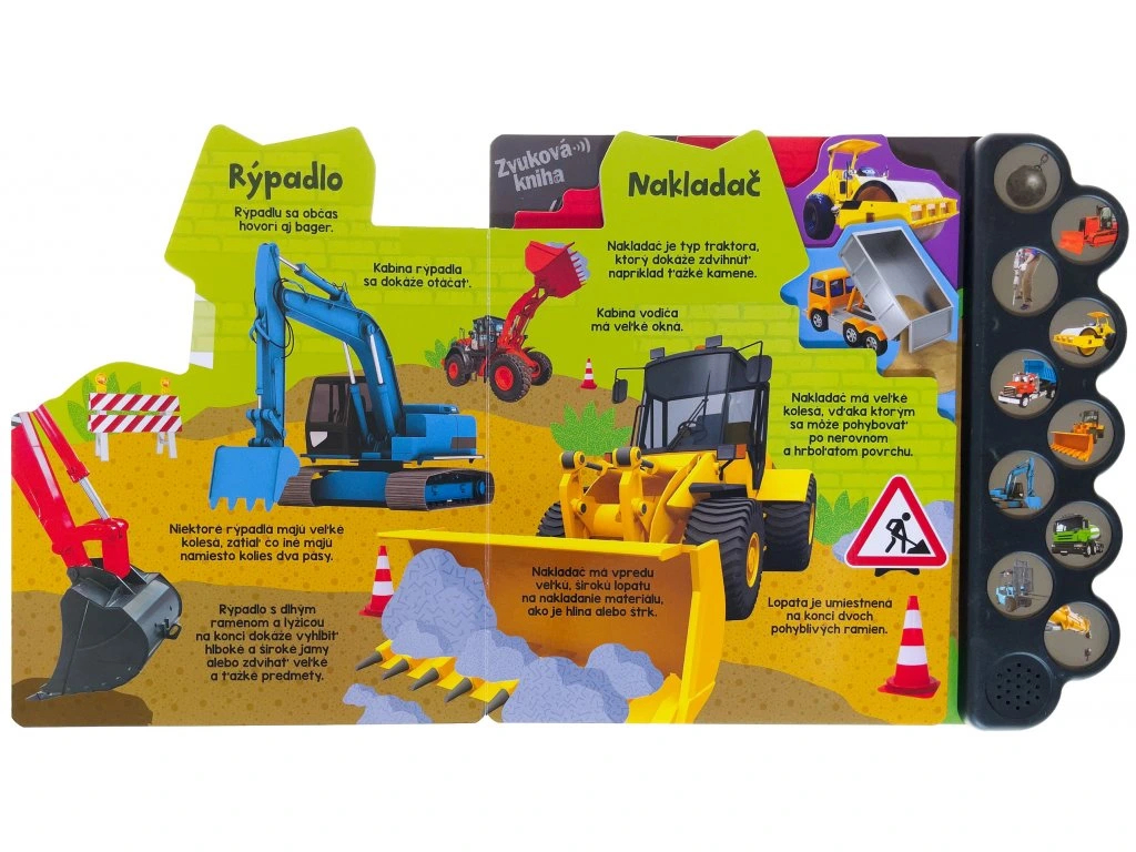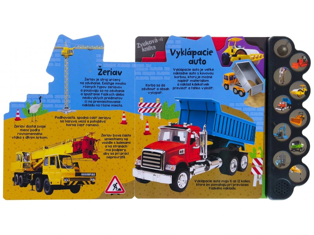 Navštívte stavbu a stavenisko plné úžasných, silných strojov a nástrojov. Táto zvuková kniha obsahuje mnoho zaujímavých informácií o rôznych stavebných strojoch. Vieš, prečo sa žeriav nazýva práve takto? Na čo slúži búracia guľa? A čomu sa hovorí "vysokozdvižka"? Odpovede na tieto a ďalšie otázky nájdete na stránkach tejto knihy. Zvuková kniha je doplnená o realistické fotografie na výrazne farebných stránkach a sprevádza ju 10 zvukov rôznych stavebných strojov. Započúvajte sa do zvukov, alebo skôr do hluku na stavenisku a zistite rozličné fakty o týchto užitočných, silných strojoch.