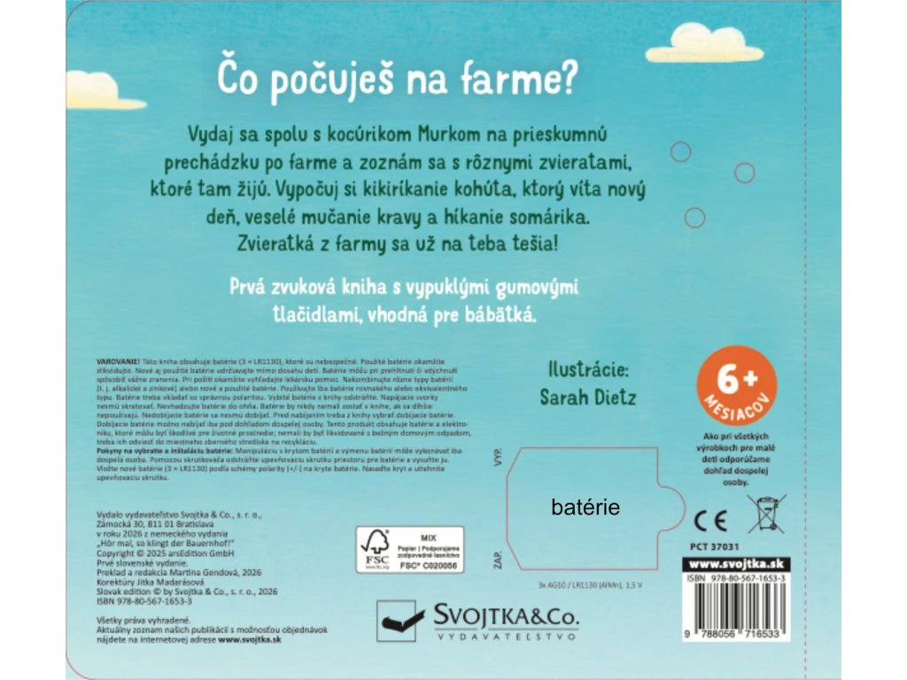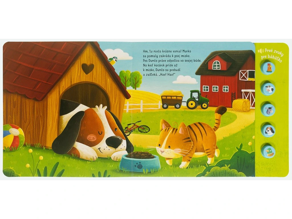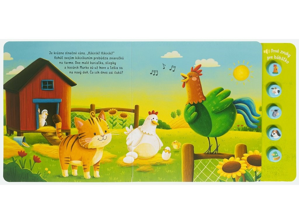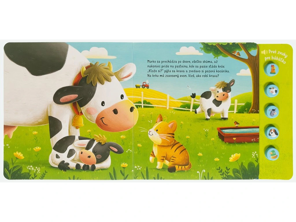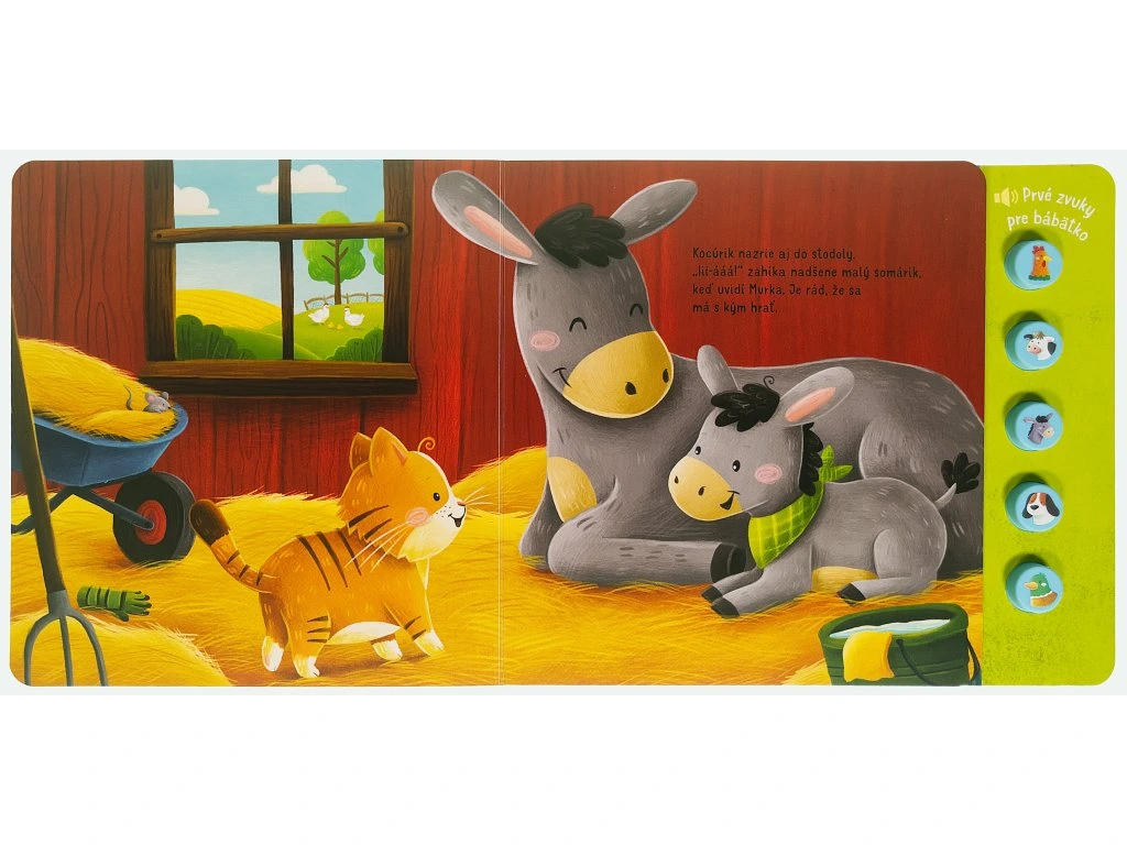 🐄🎶 Zvuky, ktoré rozprávajú príbeh — prvé zvukové dobrodružstvo pre vaše bábätko! 👶 Vydajte sa spolu s priateľským ryšavým kocúrom na farebnú prechádzku po farme, kde každý obrázok ožíva zvukmi skutočných zvierat! Stačí stlačiť tlačidlo s obrázkom zvieratka a vaše dieťatko si vypočuje charakteristické zvuky – kikiríkanie kohúta, veselé bučanie kravy či híkanie oslíka. Táto prvá zvuková knižka je navrhnutá tak, aby zaujala zmysly najmenších, podporila ich pozornosť a priniesla radosť z objavovania sveta okolo nich.