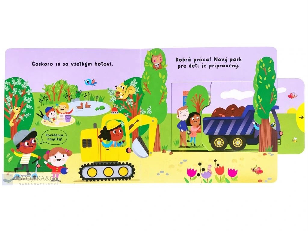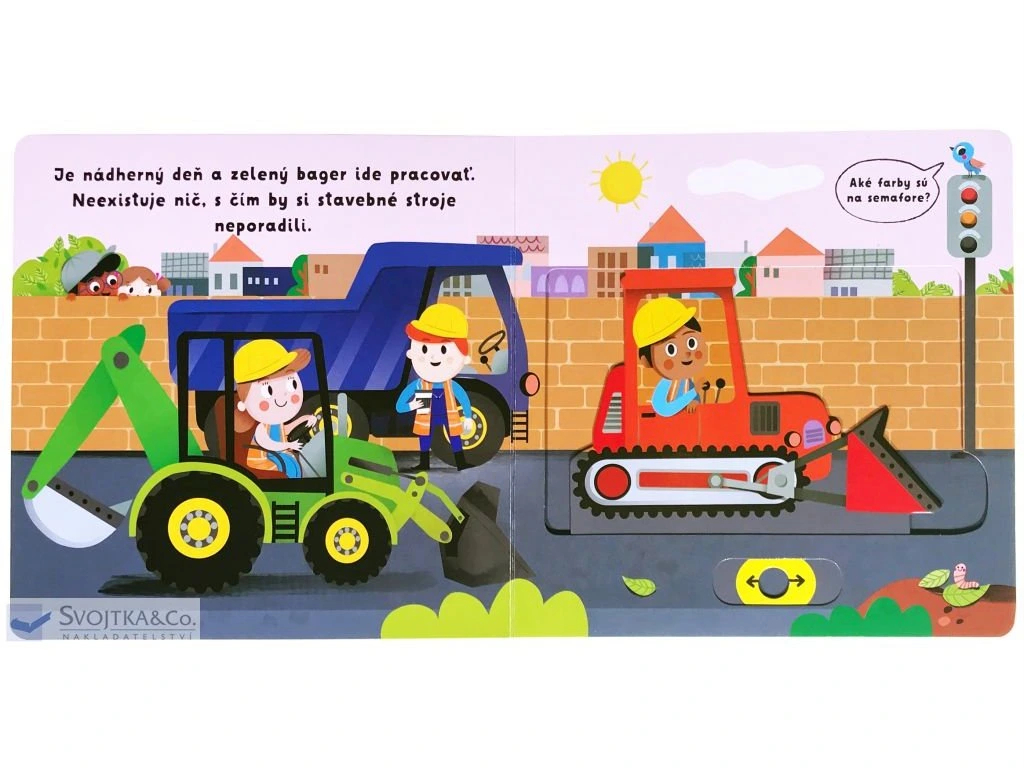 🚧 Vyraz na stavenisko plné zábavy s bagrom a jeho kamarátmi! 🏗️ V tejto dynamickej detskej knižke sa malí objavitelia zoznámia s pracovnými strojmi, ktoré nezastaví žiadna výzva – bagre naberajú a vysypávajú zeminu, rýpadlá upravujú terén a buldozéry nezaháľajú. Každá stránka je pevná a obsahuje posuvné a otočné prvky, ktoré deti môžu ťahať, posúvať a objavovať tak pohyb stroja vlastnými rukami. Precvičovanie jemnej motoriky sa tu snúbi s pohybom, tvorivosťou a nezabudnuteľnými momentmi radosti.