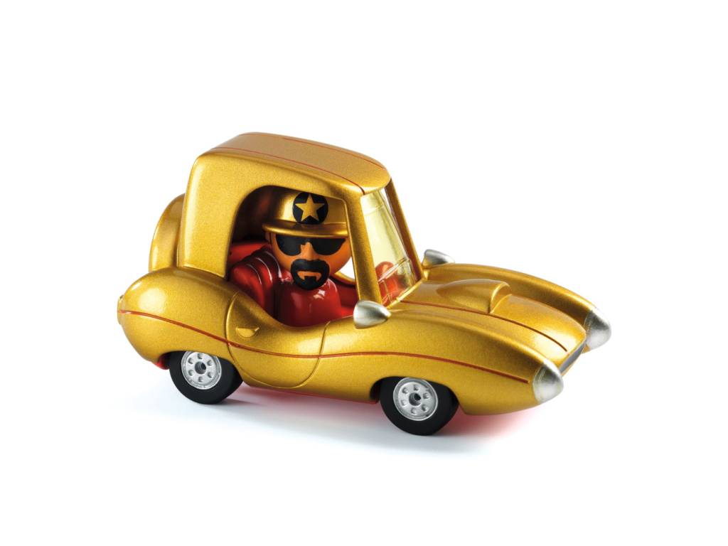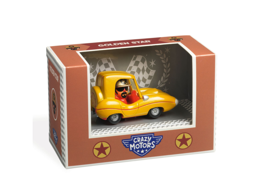 Pretekárske autíčko z originálnej kolekcie Crazy Motors od Djeco s figúrkou. Zlatá hviezda je výsostný zjav na šedých asfaltových cestách mesta.