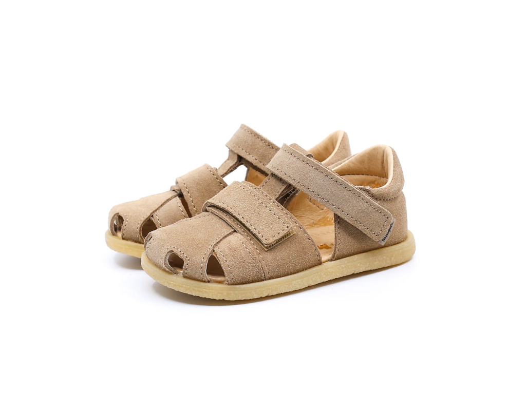 Nádherné detské sandálky z brúsenej kože v béžovej farbe ideálne do letných dní. Pršteky sú spredu skryté a pätička spevnená. Ideálne ku každému detského outfitu. Suchý zips zabezpečí skvelé upevnenie topánočky na nôžku, aj na užšiu aj na širšiu. Letné kroky plné pohody!