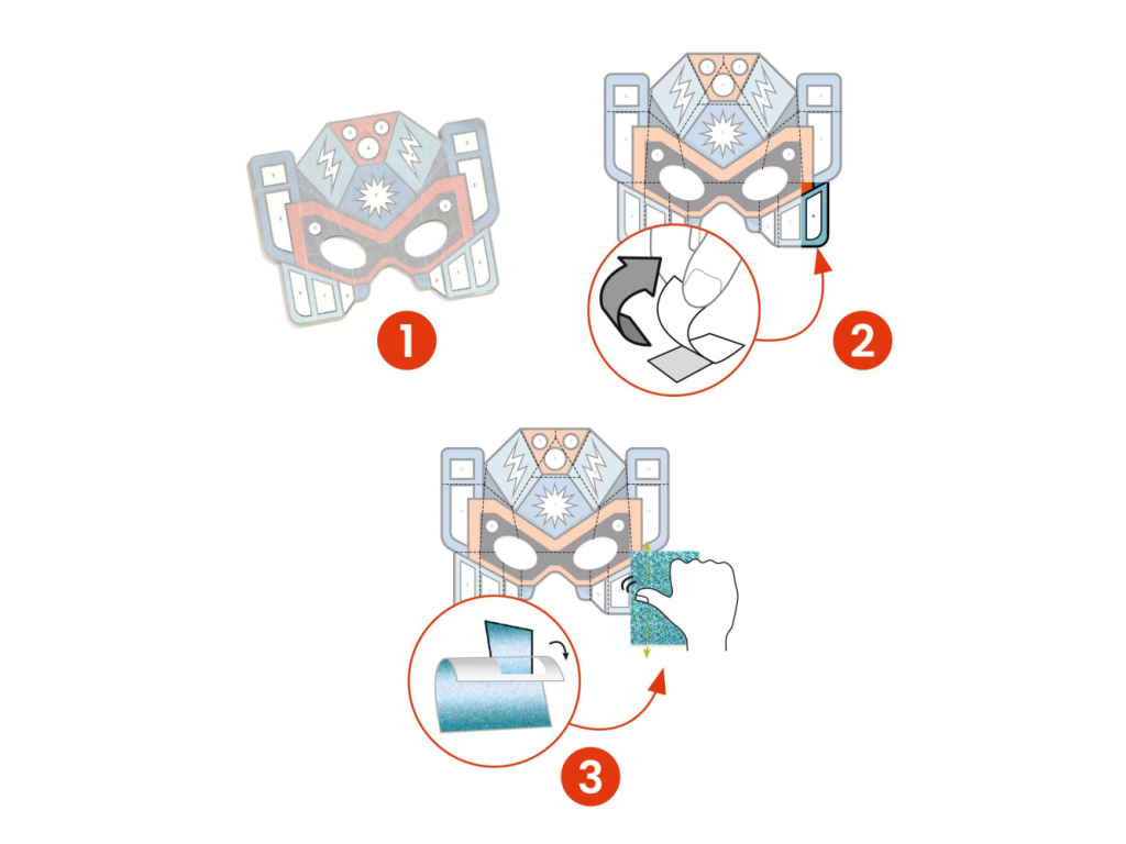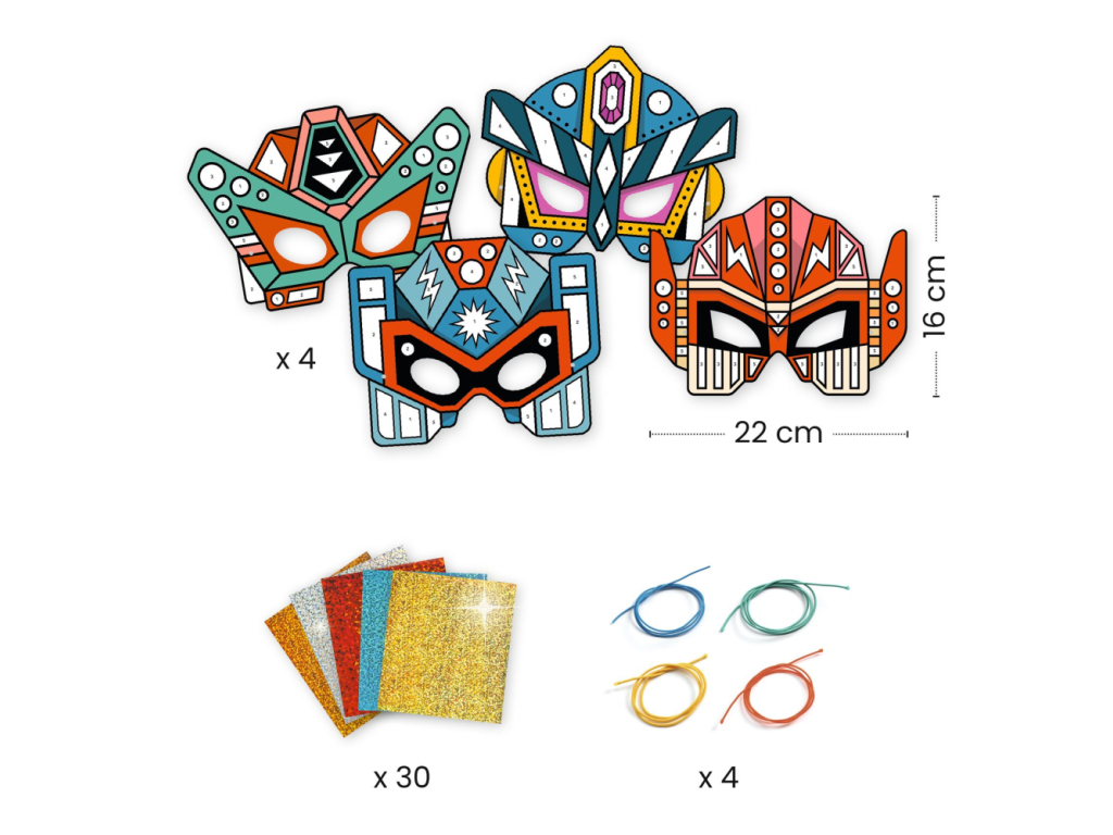 Kreatívna sada od Djeco spájajúca tvorenie s úžitkom. Dieťa ozdobí masky super robotov farebnými fóliami s metalickým leskom. Hárok fólie pritlačí na lepivú plôšku, hárok stiahne a plôška zostane polepená lesklou farebnou fóliou. Takto vyplní všetky plôšky. Na záver uviaže na masku elastickú šnúrku.