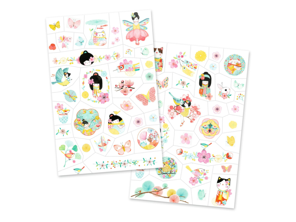 2 hárky dočasných tetovačiek s ilustráciami s japonskou tematikou - s listami čerešňových kvetov, s motýľmi či s vtáčikmi. Vhodné pre deti od 3 rokov.