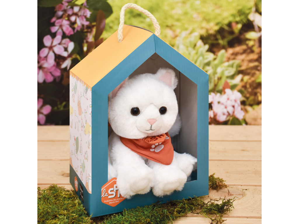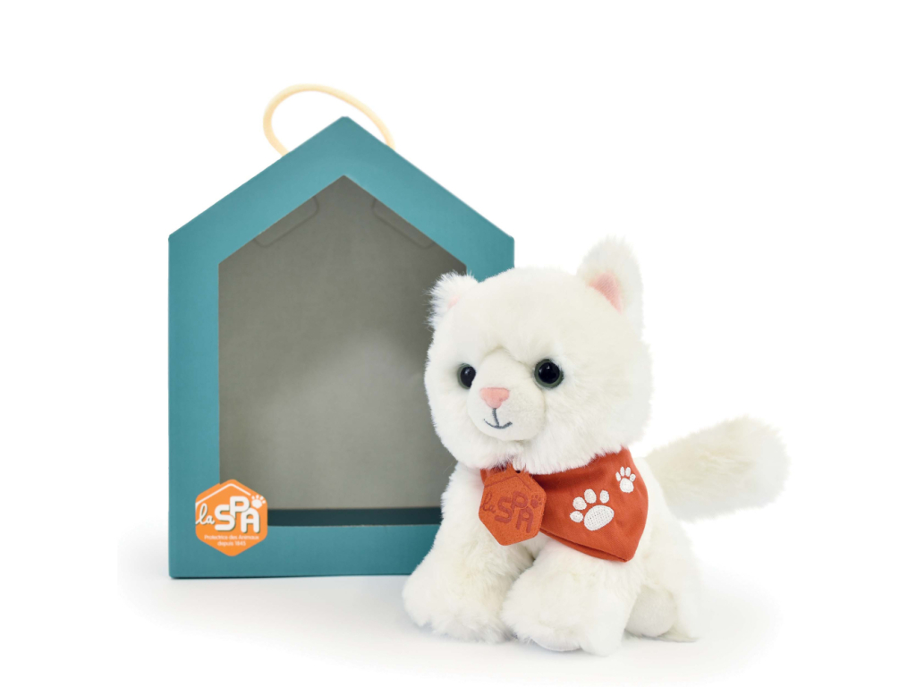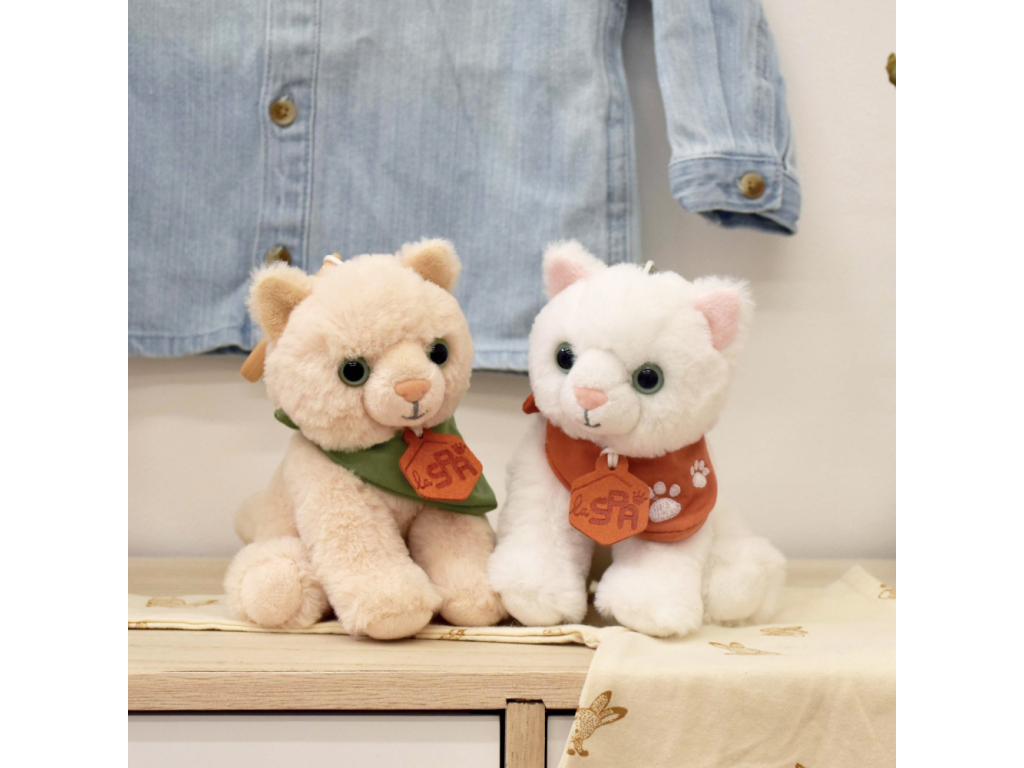 Táto rozkošná biela plyšová 16cm mačička ozdobená šatkou vo farbách SPA (Spoločnosť na ochranu zvierat) bude symbolom lepšej budúcnosti pre 45 000 zvierat, ktoré sa každoročne opúšťajú.