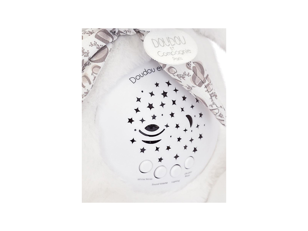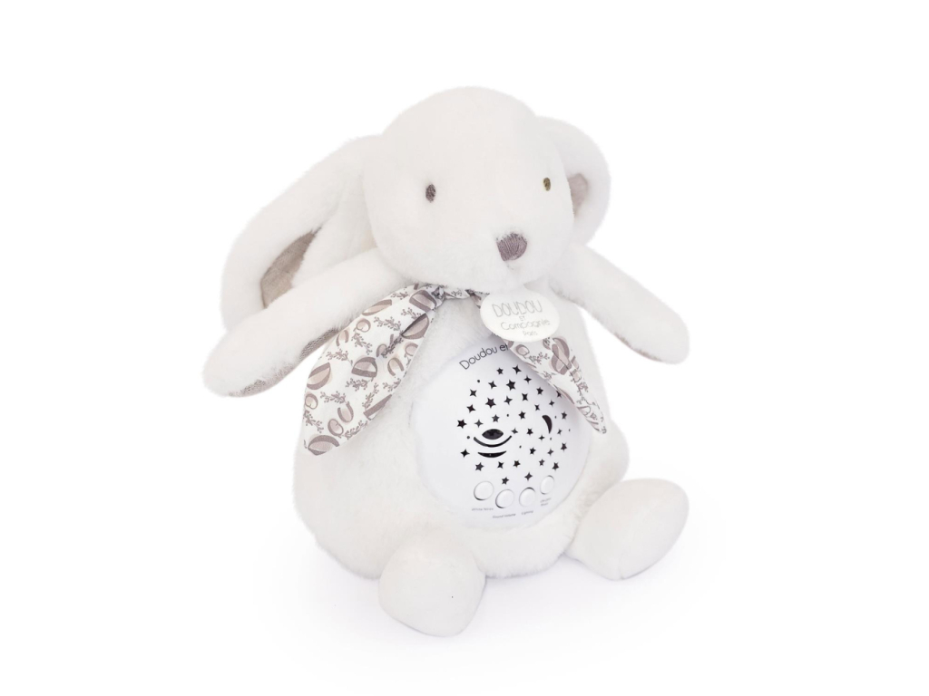 Zajačik od DouDou et Compagnie v bielej farbe je veľmi jemný a bábätko si ho rýchlo obľúbi. Na stenu si premietnite hviezdičky a upokojujúca melódia ľahko uspí bábätko.