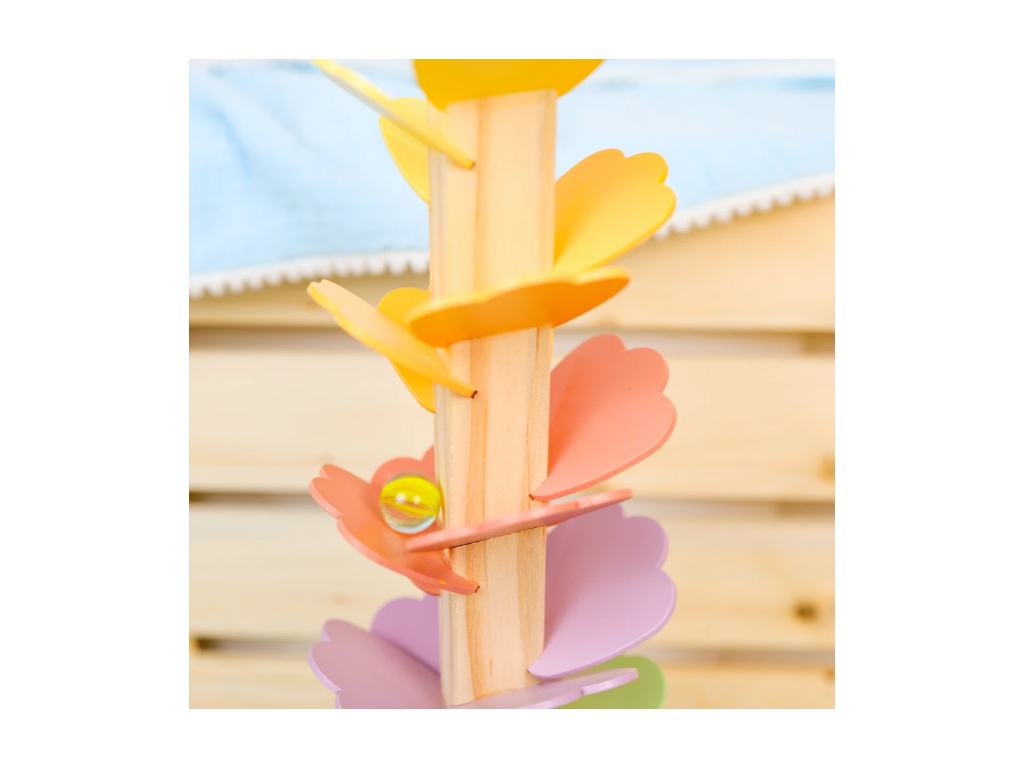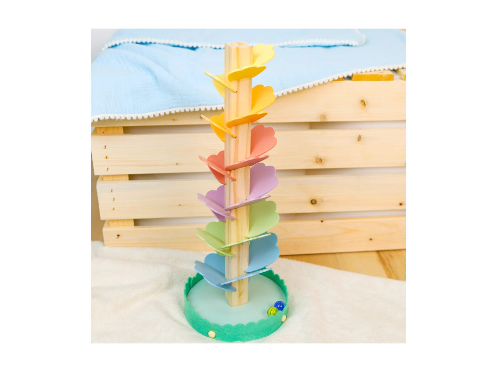 Tento nádherný zvukostrom v jemných pastelových farbách očarí deti aj dospelých. Guľôčka, ktorá sa kotúľa po farebných lístkoch, vytvára upokojujúce, melodické zvuky. Hračka podporuje zmyslové vnímanie, koordináciu pohybov a sústredenie. Vyrobený z kvalitného dreva s dôrazom na detail a bezpečnosť, je krásnym doplnkom do detskej izby aj hravým nástrojom pre relaxáciu.