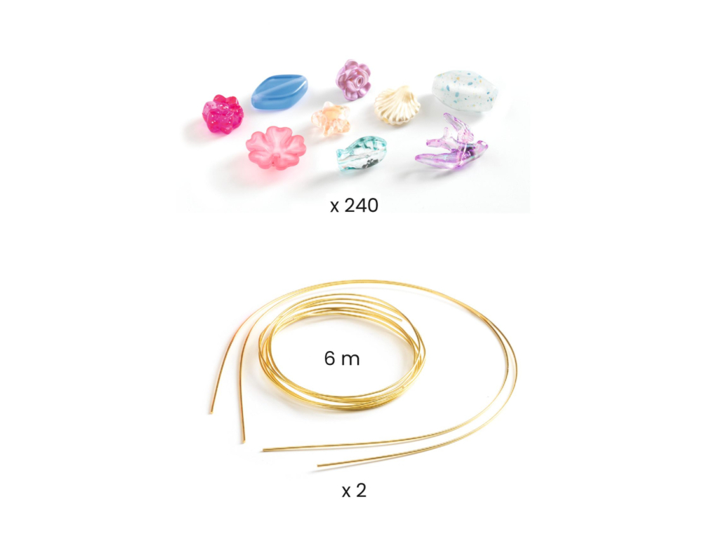 240 akrylových korálok, 2 zlaté čelenky, 6 m pružnej metalickej nite, obrázkový návod krok za krokom (bez textu).