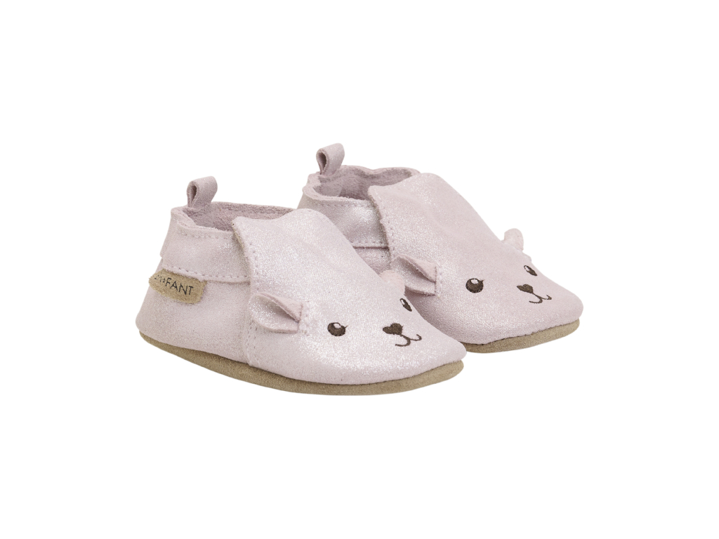 Tieto nádherné Enfant capačky z brúsenej glitrovej kože v podobe ružového zvieratka sú dokonalým doplnkom pre malé detské nožičky. Celokožené prevedenie zabezpečuje maximálny komfort, priedušnosť a mäkkosť, čo je ideálne pre prvé kroky aj pohodlné nosenie doma. Roztomilý dizajn s uškami dodáva capačkám hravý vzhľad, zatiaľ čo elastická gumička na päte zabezpečuje jednoduché obúvanie a pevné držanie na nôžke. Vhodné pre bábätká a malé deti, ktoré sa učia stáť a chodiť.