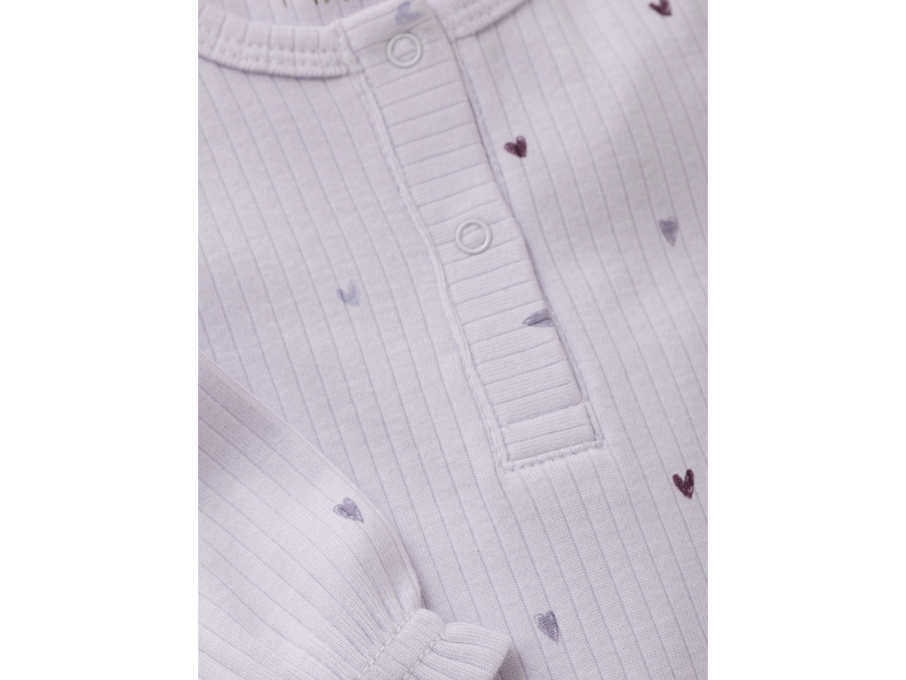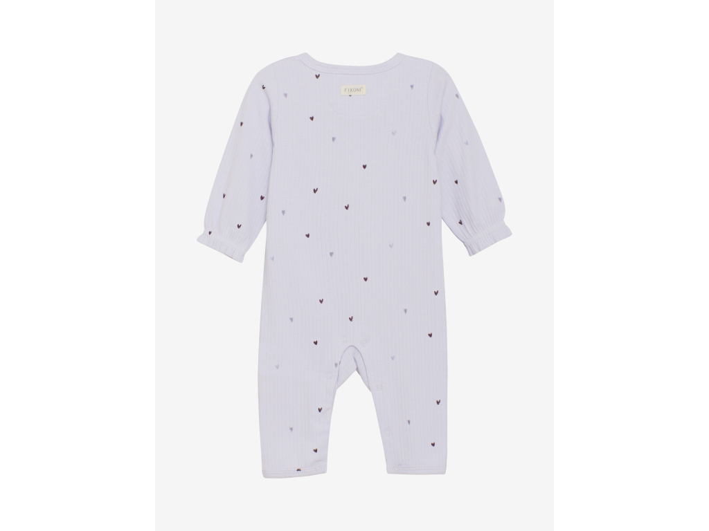 Roztomilý fialový overal Fixoni s celoplošnou potlačou srdiečok pre dievčatko z mäkkej bavlny. Pohodlný na spánok aj denné nosenie, s praktickým zapínaním.