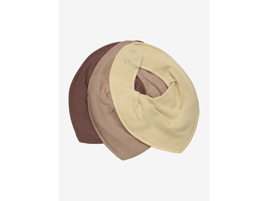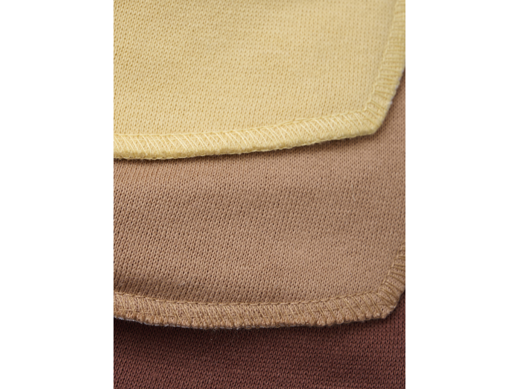 Rozkošný a praktický set 3 podbradníkov v príjemných odtieňoch hnedej a žltej. Praktické a krásne zároveň. Zapínanie podbradníkov je na 2-úrovňovú patentku pri krku.
