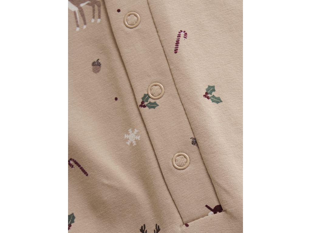 Mäkučký bavlnený overal v sviatočnom dizajne prinesie bábätku pohodlie počas spánku aj hier. Praktické zapínanie uľahčí obliekanie a prebaľovanie. Ideálny k Vianociam, na rodinné fotky či prvé sviatočné chvíle.