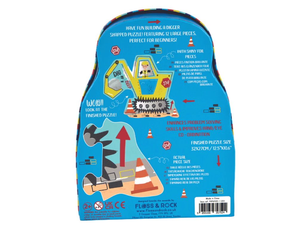 Malí stavitelia si prídu na svoje s týmto puzzle od Floss & Rock! Obsahuje 12 veľkých, pevných dielikov s motívom stavby a bagra, ideálne pre rozvoj jemnej motoriky a logického myslenia. Perfektné pre malé ruky a zábavu pri skladaní.