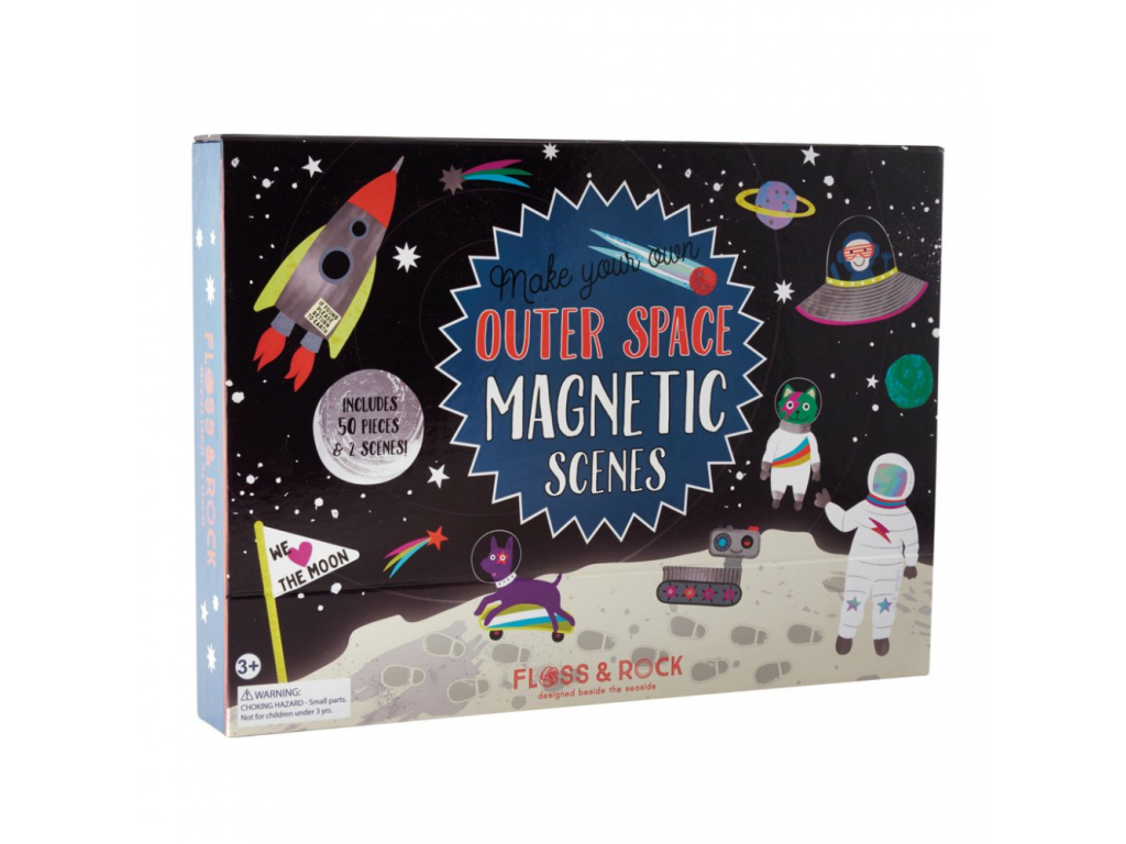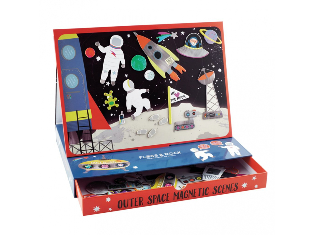 Vyrazte na vesmírne dobrodružstvo s magnetickou hračkou Floss&Rock! Táto kreatívna hra obsahuje viac než 50 magnetických dielikov a dve vymeniteľné vesmírne pozadia, ktoré deťom umožňujú vytvárať nekonečné príbehy a scény. Ideálna na rozvoj predstavivosti, jemnej motoriky a koordinácie očí a rúk.