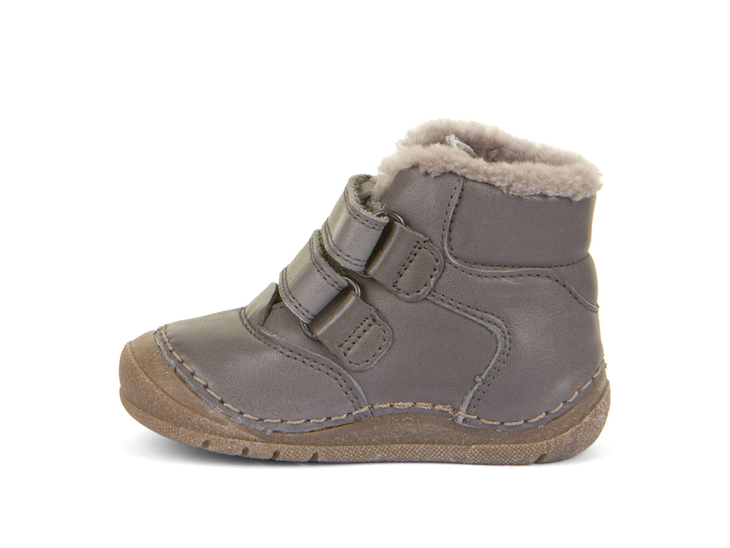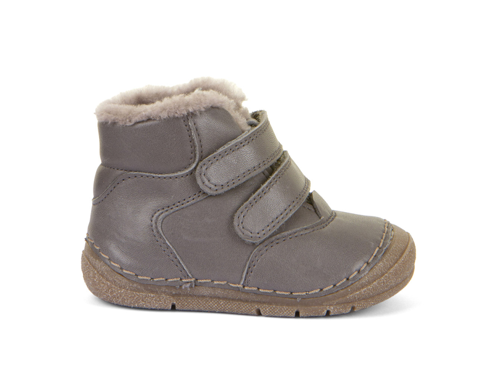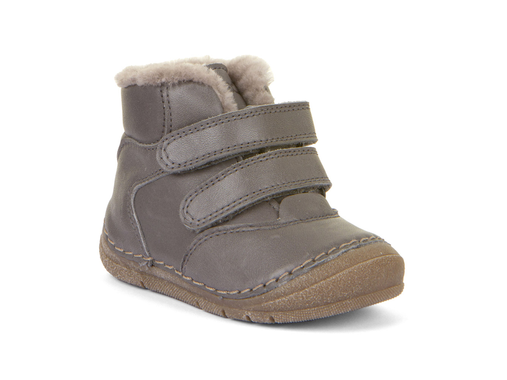 Kožené detské sivé topánky na zimu s podšívkou z ovčej kožušiny – extra ľahké, ohybné a pohodlné. Tenká a ohybná barefoot podrážka z prírodnej gumy umožňuje deťom vnímať nerovnosti terénu a reagovať na ne. Takto si prirodzene posilňujú svaly chodidla. Mäkká poddajná koža sa postará o pohodlie pri nosení a priedušnosť obuvi. Teplá podšívka z jemnej kožušiny spoľahlivo ochráni pred chladom. Zapínanie na suchý zips umožňuje jednoduché prezúvanie a prispôsobenie šírky obuvi. Gumená podrážka je extra flexibilná a ohybná vo všetkých smeroch s nulovým rozdielom medzi pätou a špicou, tzv. „zero drop“.