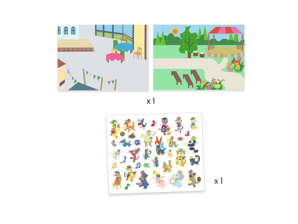2 veľké ilustrované pozadia, ktoré deti môžu oživiť a vytvoriť živé hudobné a farebné scény.