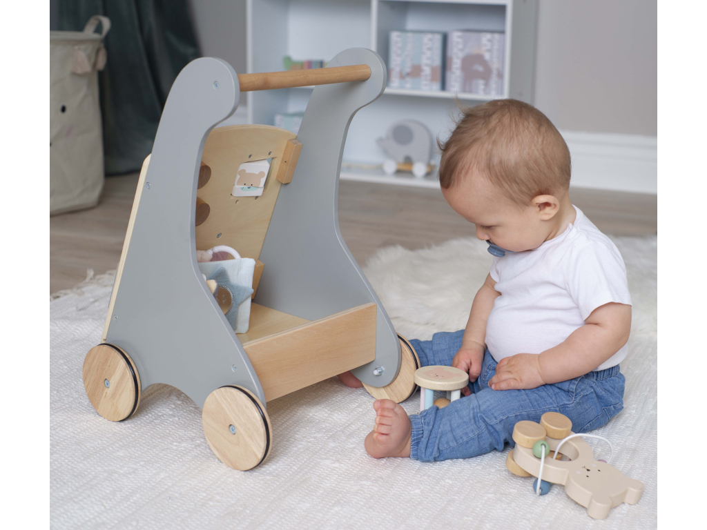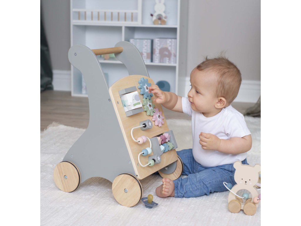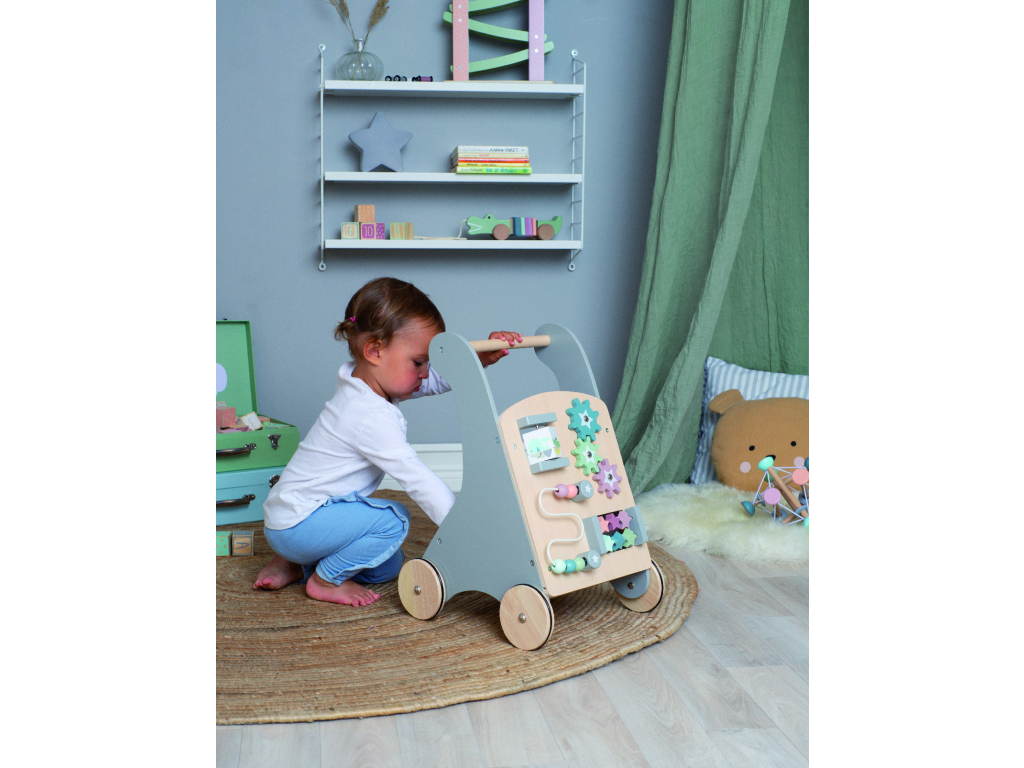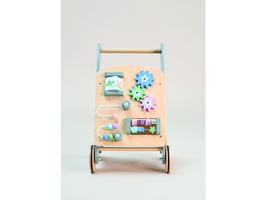 Toto krásne drevené chodítko v sivej farbe je ideálnym spoločníkom pre vaše dieťa pri jeho prvých krôčikoch. Okrem podpory pri chôdzi ponúka množstvo zábavných aktivít, ktoré rozvíjajú jemnú motoriku, koordináciu a kreativitu. Obsahuje napríklad farebné ozubené kolieska, bludiská, počítadlo či rôzne pohyblivé prvky. Chodítko je vyrobené z kvalitného a ekologického dreva, s bezpečnými a hladkými hranami, aby bolo vhodné pre malé deti. Ideálny darček pre najmenších objaviteľov! Aktívne chodítko nielen povzbudí vaše dieťa, aby sa naučilo chodiť, ale tiež mu pomôže rozvíjať rovnováhu a jemné motorické zručnosti.