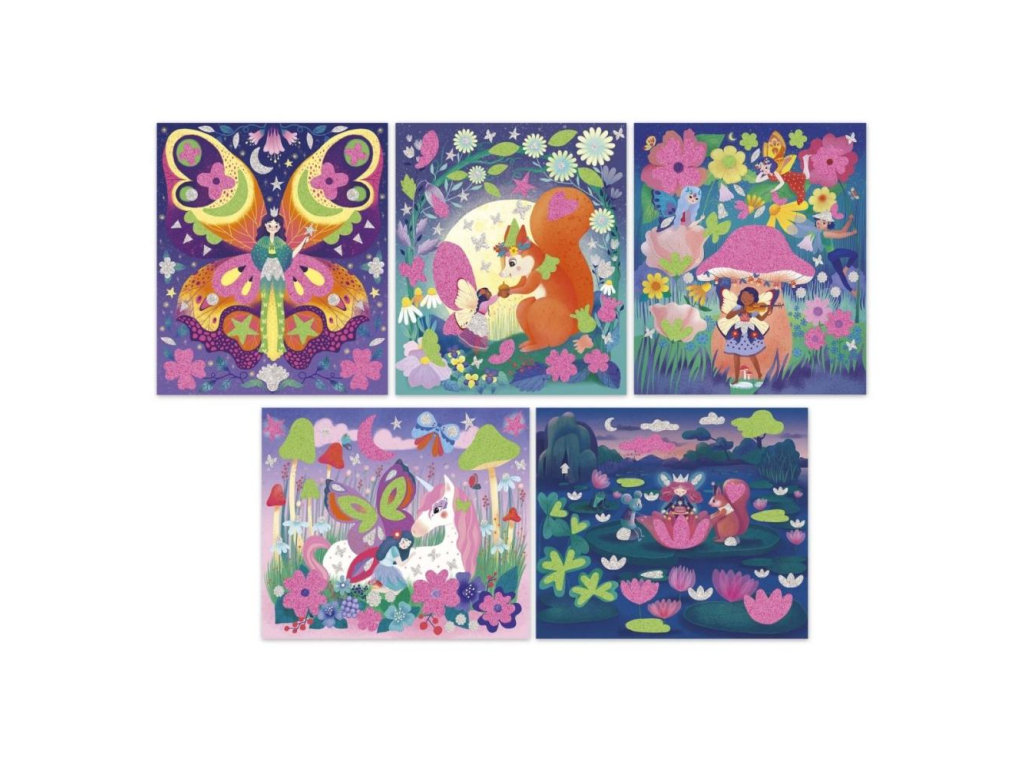 Nalepovanie penovými nálepkami a svietiaci piesok pre deti od 6 rokov, obsahuje 5 obrázkov na dotvorenie z magického sveta víl.