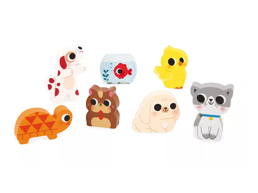 Ryba Bubbles robí triky vo svojej miske, zatiaľ čo kanárik Holly pozorne sleduje svojich zvieracích priateľov! Objavte naše drevené puzzle s motívom domácich zvierat, ktoré je určené pre deti od 18 mesiacov. Toto rané učenie sa skladá zo 7 hrubých kúskov, ktoré môžu malé ručičky ľahko uchopiť. Každý prvok tejto skladačky bol starostlivo navrhnutý tak, aby predstavoval každodenné zvieratá: psa, mačku, korytnačku, králika, papagája, rybu a škrečka. A to nie je všetko! Tieto kúsky možno použiť aj ako figúrky na predĺženie hracieho času a stimuláciu fantázie vášho dieťaťa. Toto drevené puzzle je viac než len hra, je to vzdelávací nástroj, ktorý pomáha rozvíjať jemnú motoriku dieťaťa. Manipuláciou a skladaním puzzle si vaše dieťa zlepší obratnosť a koncentráciu. Táto hračka pre deti je ideálna ako prvý spôsob, ako sa naučiť mená domácich miláčikov, s ktorými sa deti určite stretnú, keď vyrastú. Hraním sa s figúrkami a ich vkladaním do dosky si vaše dieťatko rozvinie svoje uchopovacie schopnosti. Drevené puzzle je tiež skvelý spôsob, ako stimulovať logické myslenie! Dajte túto rozkošnú hádanku dieťaťu pri jedle, aby ste ho zabavili, alebo ako pokojnú aktivitu po zdriemnutí. Ktoré zviera sa stane ich obľúbeným? Drevené puzzle FSC™ s vodou riediteľnou farbou.