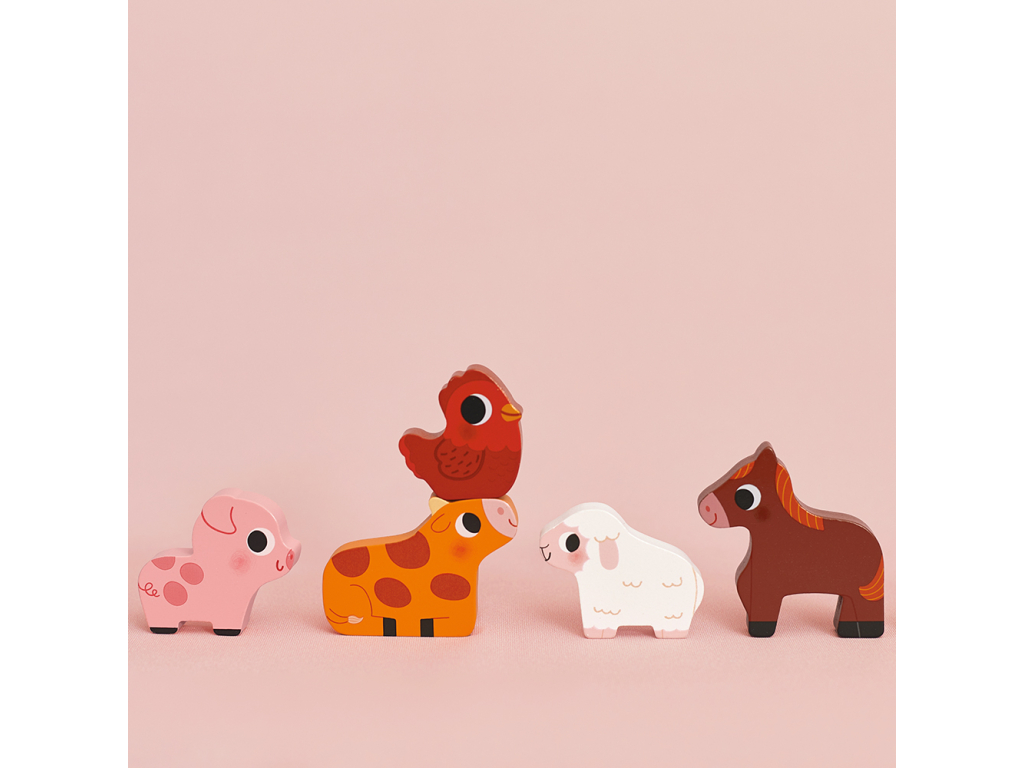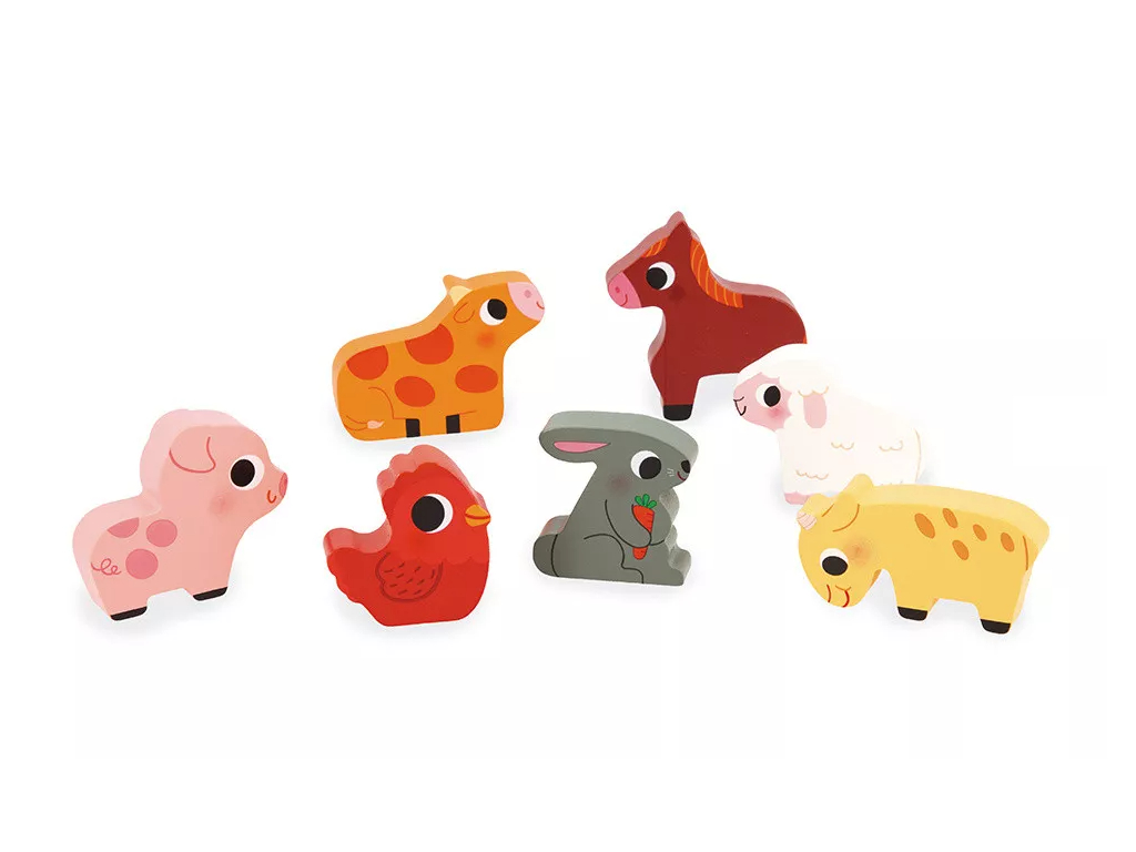 Pozývame všetkých začínajúcich farmárov! Objavte naše drevené puzzle s farmárskou tematikou, určené pre deti vo veku od 18 mesiacov. Toto rané učenie sa skladá zo 7 hrubých kúskov, ktoré môžu malé ručičky ľahko uchopiť. Každý kúsok skladačky bol starostlivo navrhnutý tak, aby predstavoval hospodárske zvieratá: koňa, prasa, kura, králika, kravu, ovcu a kozu. A to nie je všetko! Tieto kúsky možno použiť aj ako figúrky na predĺženie hracieho času a stimuláciu fantázie vášho dieťaťa. Toto drevené puzzle je viac než len hra, je to vzdelávací nástroj, ktorý pomáha rozvíjať jemnú motoriku dieťaťa. Manipuláciou a zasúvaním dielikov si vaše dieťa zlepší obratnosť a koncentráciu. Táto hračka pre deti je ideálna ako prvý prístup k učeniu sa mien farmárov, ktoré dieťatko určite objaví, keď vyrastú a začnú objavovať krajinu. Hraním s figúrkami a ich vkladaním do dosky si dieťa rozvinie svoje uchopovacie schopnosti. Drevené puzzle je tiež skvelý spôsob, ako stimulovať logické myslenie! Dajte túto rozkošnú hádanku dieťaťu pri jedle, aby ste ho zabavili, alebo ako pokojnú aktivitu po zdriemnutí. Ktoré zviera sa stane ich obľúbeným? Drevené puzzle FSC™ s vodou riediteľnou farbou.