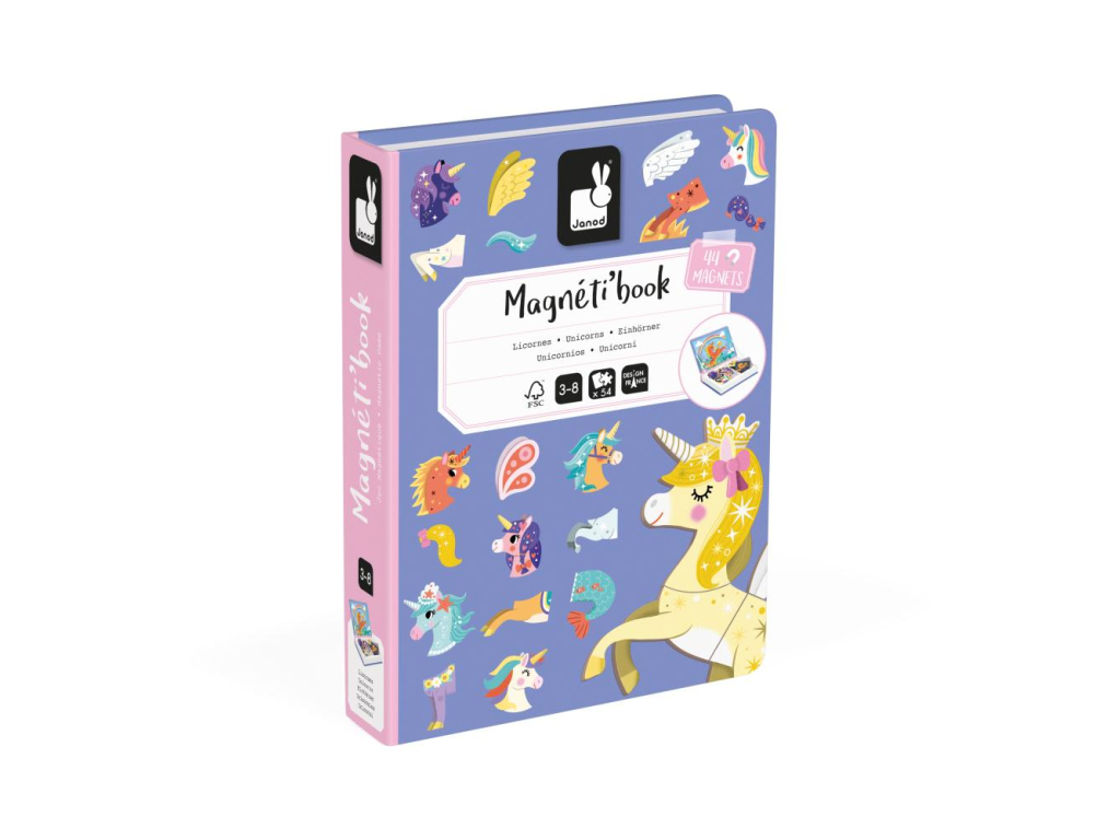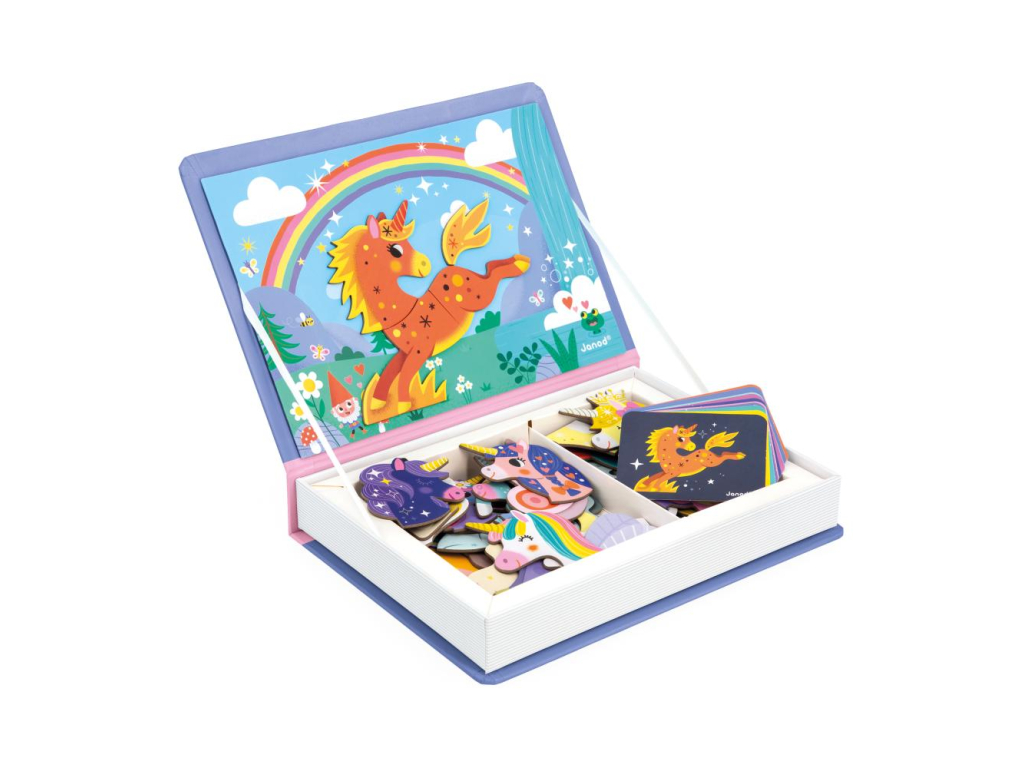 Táto magnetická hračka pomáha deťom vytvoriť čarovné zvieratká - jednorožcov a zároveň rozvíjať ich predstavivosť. Môžu byť dokonca kreatívnejší a môžu si vymyslieť svojich vlastných jednorožcov zmiešaním magnetiek. Magnetibook obsahuje 44 magnetov a 10 kariet.
