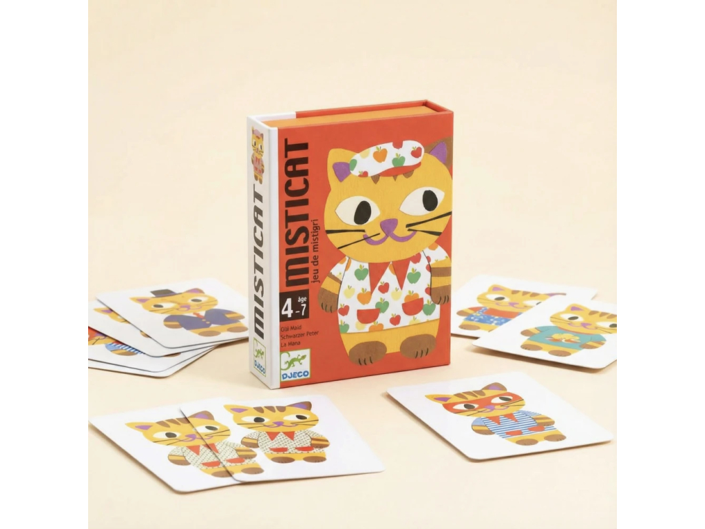 Misticat je hravá a krásne ilustrovaná kartová hra pre deti od 4 do 7 rokov, ktorá prináša modernú a zábavnú verziu klasického Čierneho Petra. Úlohou hráčov je zbierať čo najviac dvojíc – no medzi kartami sa ukrýva čudná mačka Misticat, ktorá všetko poriadne zamotá! Kto ju bude mať na konci hry, prehráva. Táto jednoduchá, no napínavá hra je ideálna na prvé hráčske skúsenosti. Deti si pri hraní precvičujú pamäť, sústredenie aj pozorovacie schopnosti, učia sa trpezlivosti a zvládaniu napätia. Hra zároveň podporuje komunikáciu a spoločné plánovanie, takže je výborná pre rodiny aj menšie detské kolektívy. Kompaktné balenie umožňuje vziať si ju kamkoľvek – na dovolenku, do auta, k starým rodičom či na piknik. Jedna partia trvá len pár minút, no zabaviť dokáže na celé hodiny.