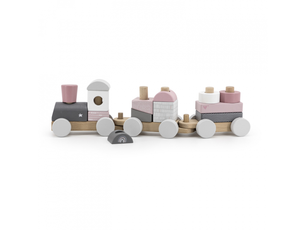 Zábavný, detailne prepracovaný drevený vláčik v ružových odtieňoch pre najmenšie deti!