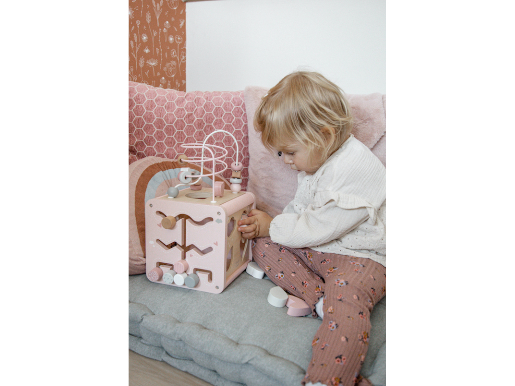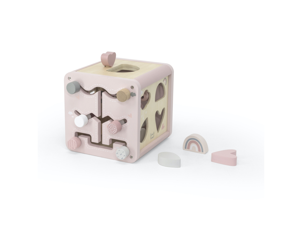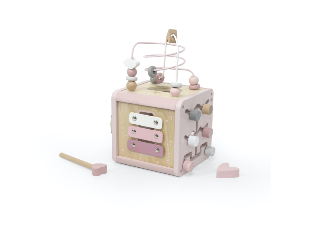 Kocka s aktivitami 5 v 1 belgickej značky Label Label obsahuje vkladačku tvarov, ozubené kolieska, bludisko, xylofón a labyrint z korálikov, ktorý deti celkom iste zaujme. Bludisko z korálikov môžete od kocky oddeliť a dostanete tak dve samostatné hračky.