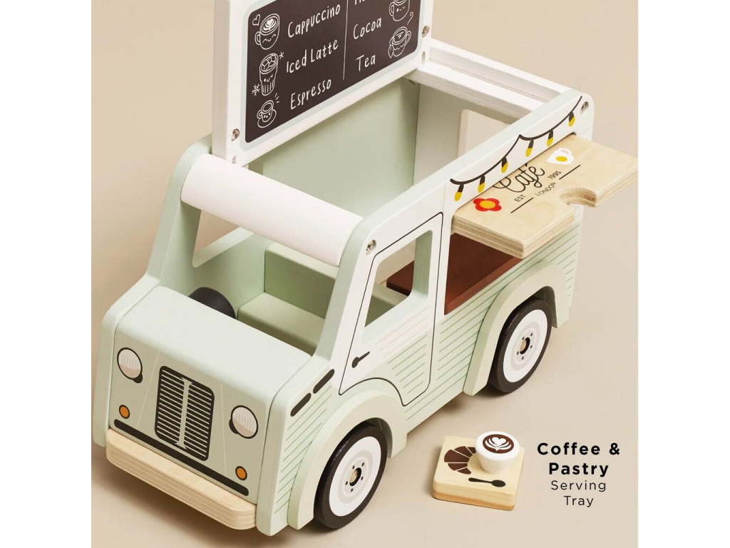Mobilná kaviareň Street coffee. Táto štýlová dodávka vo vintage dizajne je vyrobená z FSC® certifikovaného dreva, natretá jemnou pistáciovo zelenou a bielou farbou. Vďaka krásne spracovaným detailom a ilustráciám po všetkých stranách zaujme na prvý pohľad. Strieška sa dá ľahko otvoriť - vo vnútri sa ukrýva menu s ponukou kávy a čaju. Predné výdajné okienko zase umožňuje malým baristom obsluhovať svojich zákazníkov ako v skutočnej pojazdnej kaviarni.