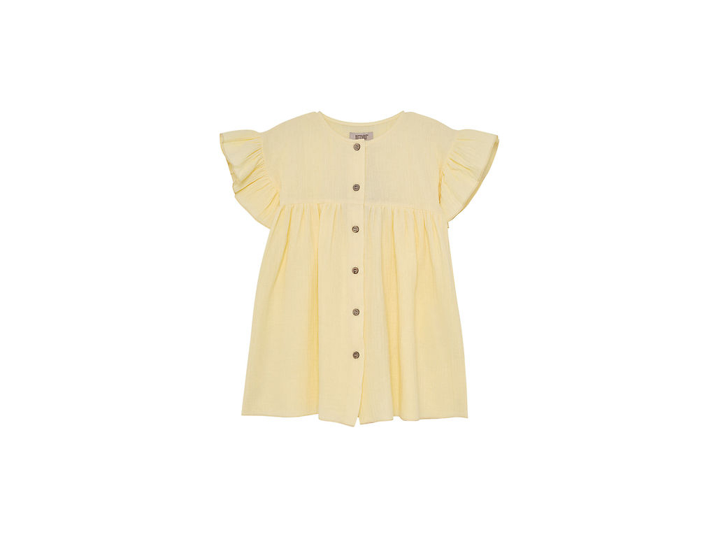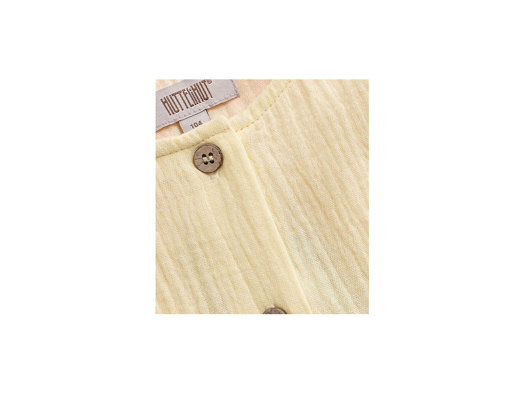 Ľahučké šaty Huttelihut vo svetložltom odtieni. Šaty Huttelihut majú krátke rukávy s volánikmi a zapínanie na gombíky vpredu. Šaty majú jednoduchý strih a vzdušnú štruktúru. Sú vyrobené z jednej vrstvy mušelínu.