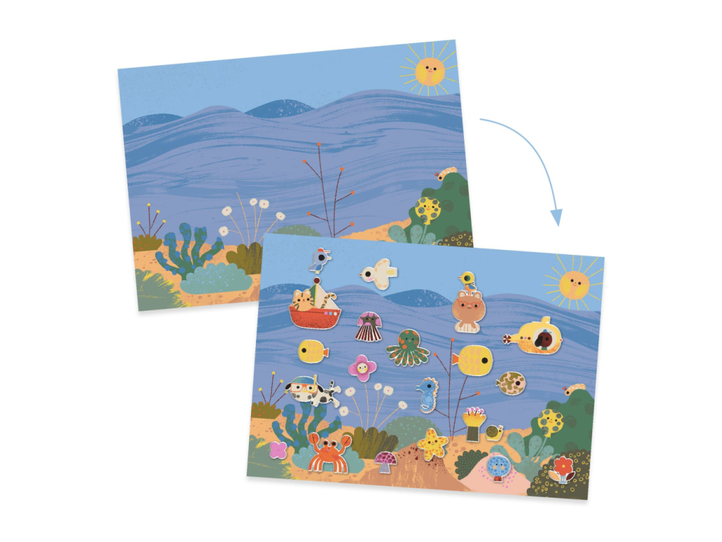 Veľká DJECO sada, pri ktorej sa deti zabavia pri vytváraní zábavných a dobrodružných scén so zvieratkami pri mori alebo na vidieku, dve úžasné pozadia na skúmanie a dokončovanie.