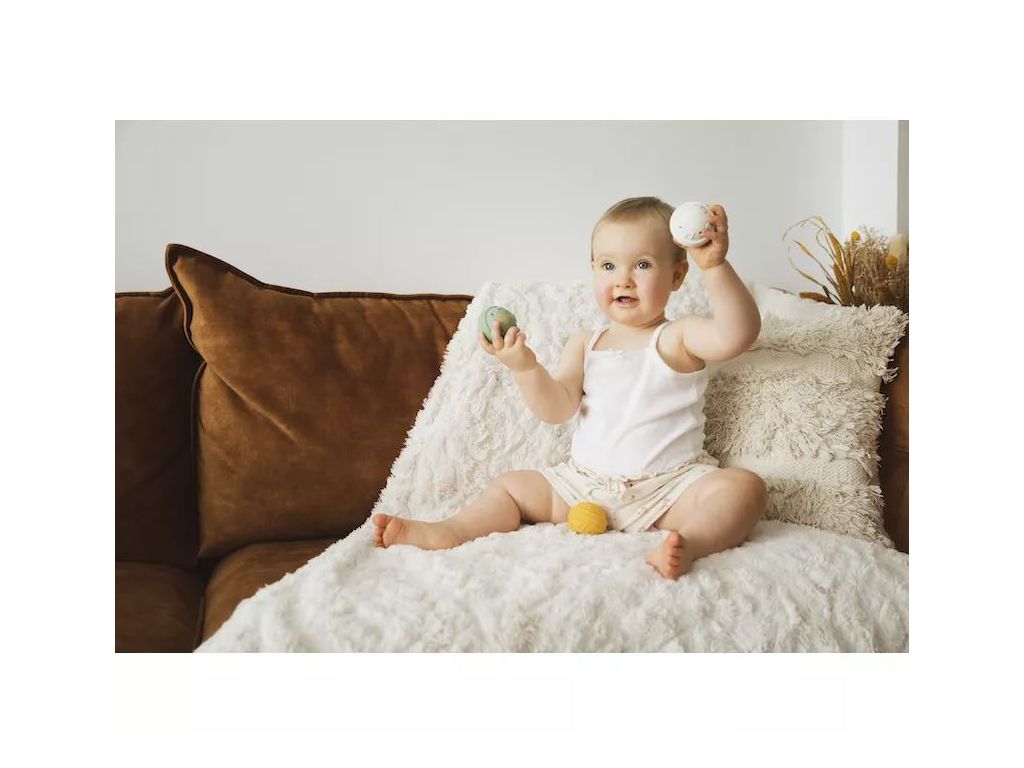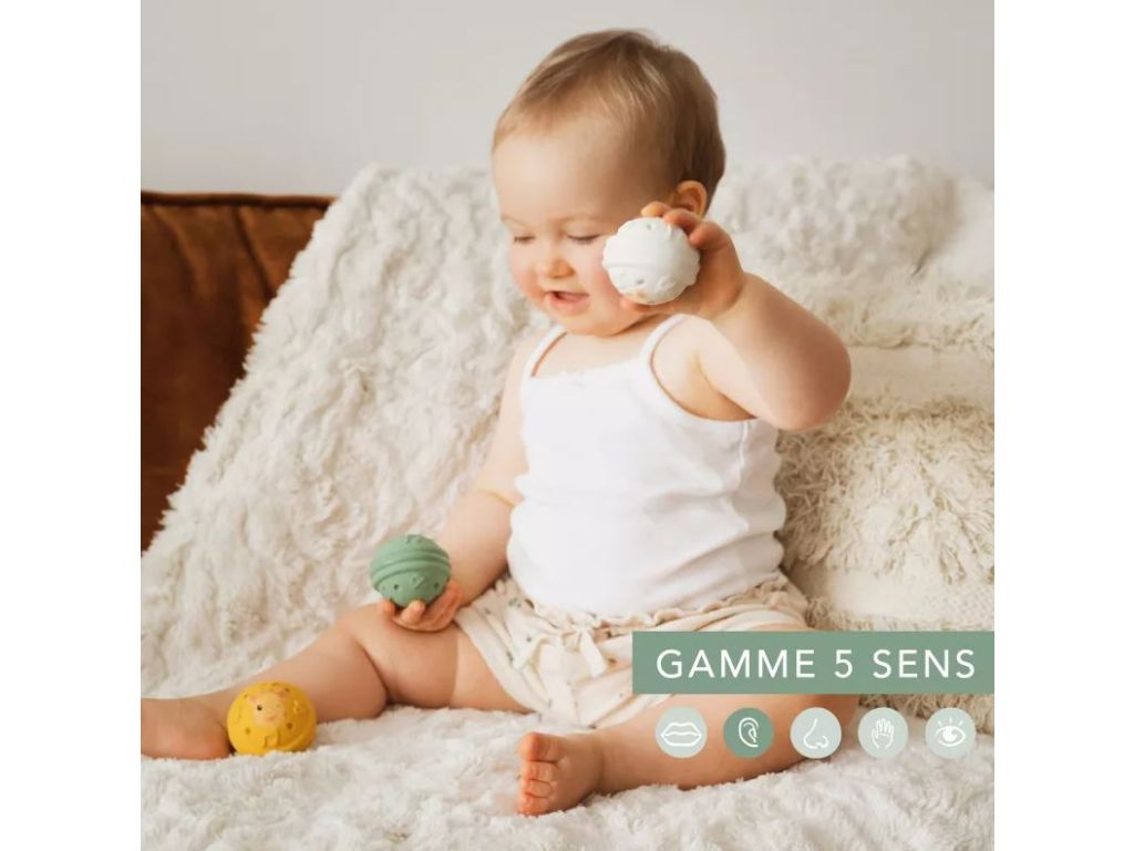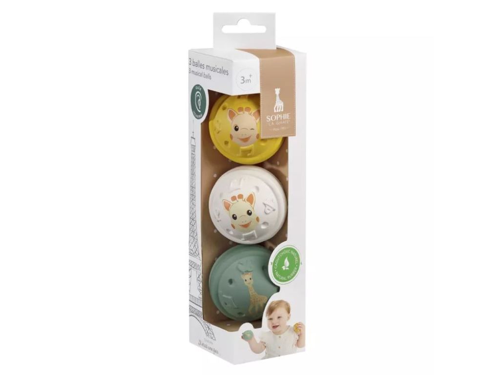 3 loptičky s rôznymi zvukmi, ktoré stimulujú sluch dieťaťa. Tieto 3 loptičky sú vyrobené zo 100% prírodného kaučuku, sú ľahučké a ľahko sa nimi manipuluje. Ideálne na tréning jemnej motoriky