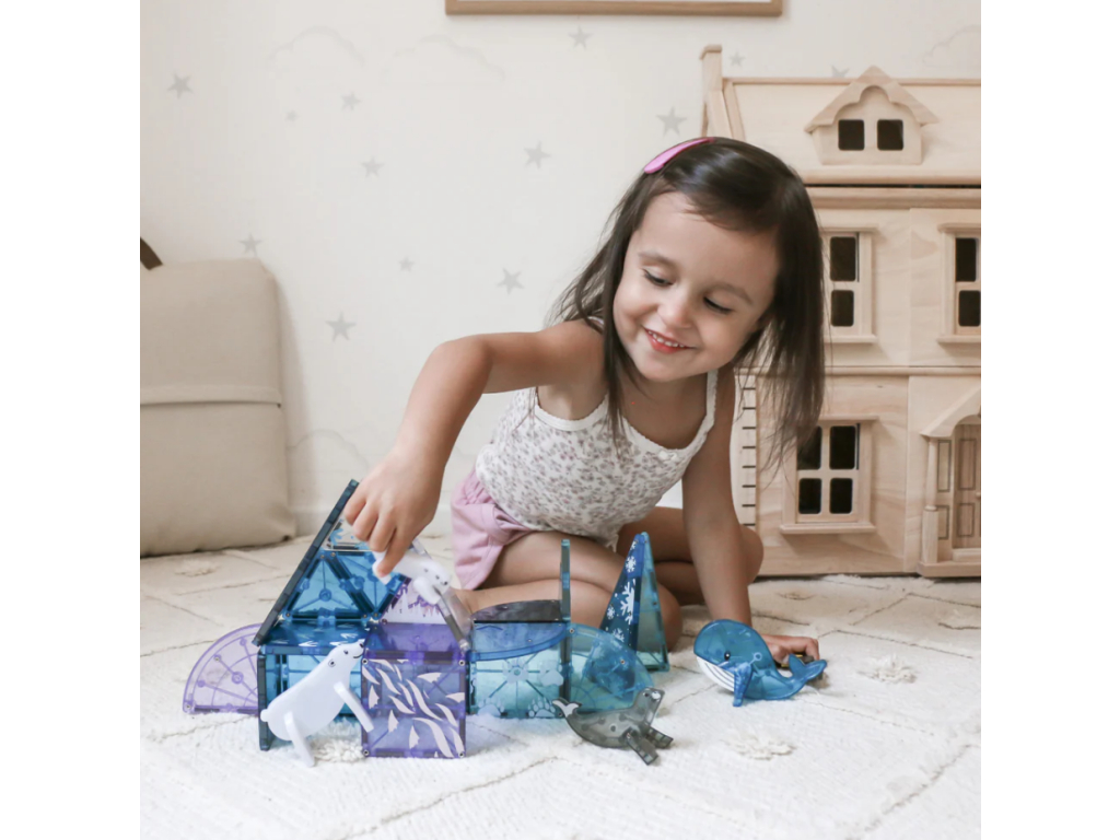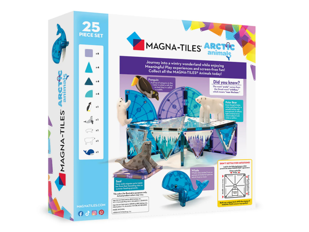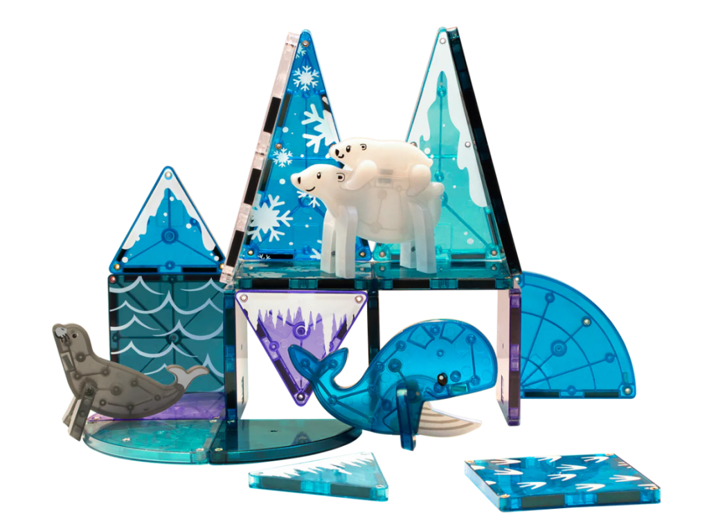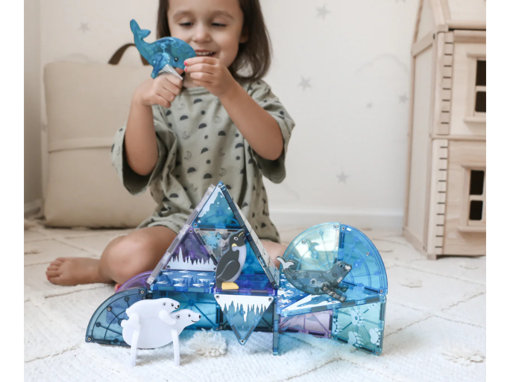 Úžasná magnetická stavebnica MAGNA-TILES® Arctic prináša hodiny nápaditej a sústredenej zábavy. Obsahuje päť arktických zvieracích priateľov: tučniaka, tuleňa, mláďatko ľadového medveďa, ľadového medveďa a veľrybu a taktiež magnetické dieliky s detailmi ľadu a zvieracích stôp. Deti si môžu vytvoriť vlastné prostredie plné ľadovcov a zvierat pochádzajúcich z chladnejšieho podnebia a zároveň sa naučiť fakty o polárnych zvieratkách. Vymýšľajte stále nové varianty a rozmanité stavby. Stavebnica je kompatibilná so všetkými magnetickými sadami MAGNA-TILES.
