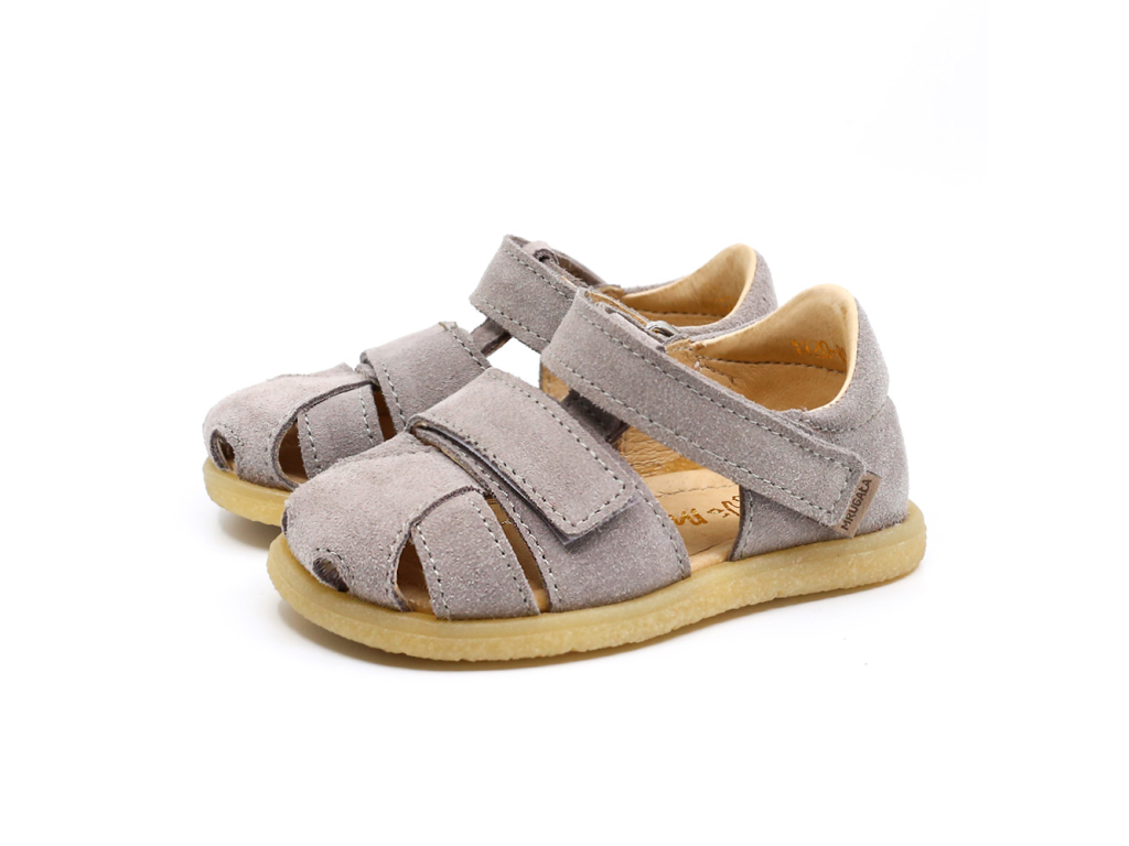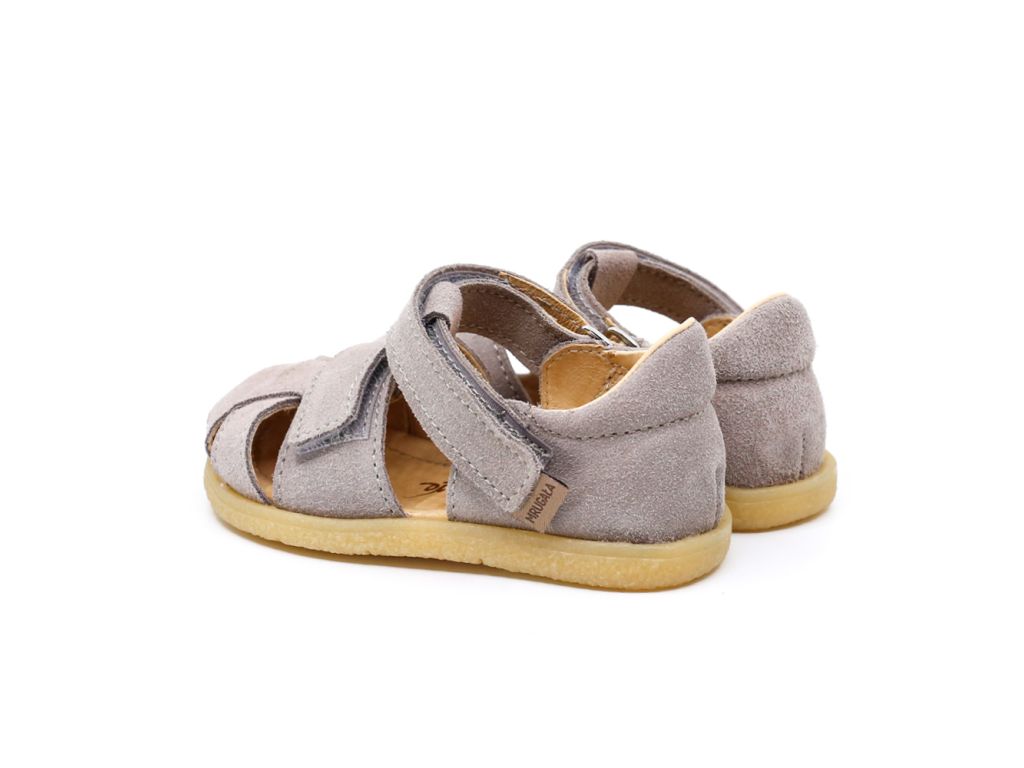 Nádherné detské sandálky z brúsenej kože v sivej farbe ideálne do letných dní. Pršteky sú spredu skryté a pätička spevnená. Ideálne do každého detského outfitu.