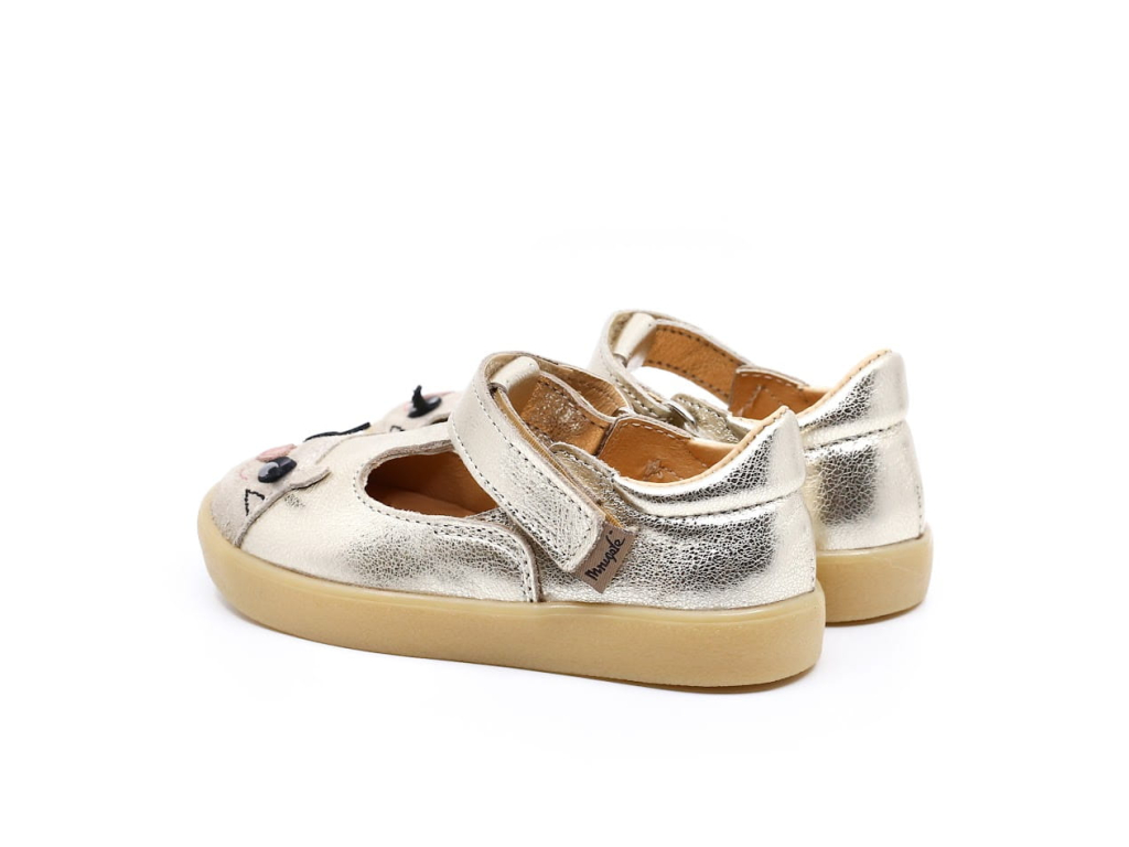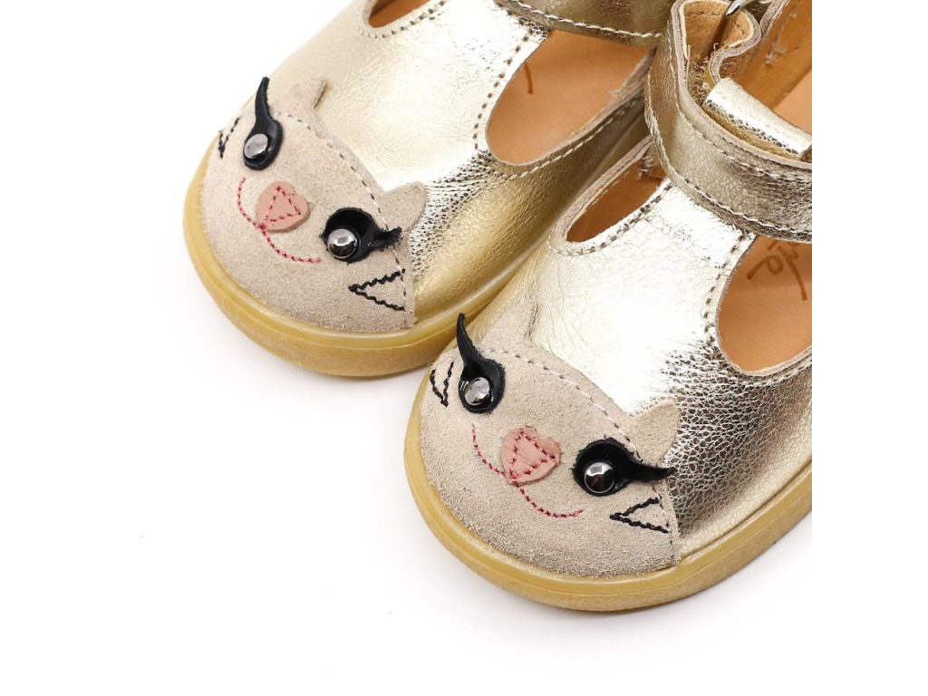 Pohodlné kožené zlaté balerínky z hladkej kože s rozkošnou aplikáciou mačičky na prstoch. Ideálne do školy alebo škôlky! Zapínanie na suchý zips zabezpečí komfortné a ľahké obúvanie.