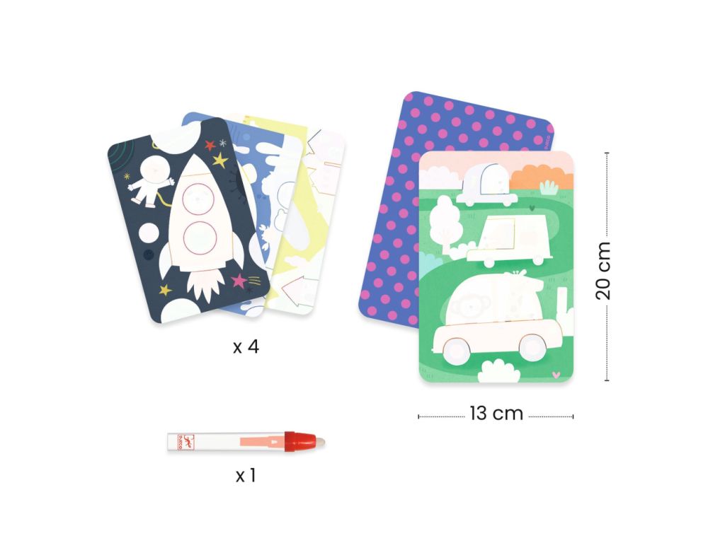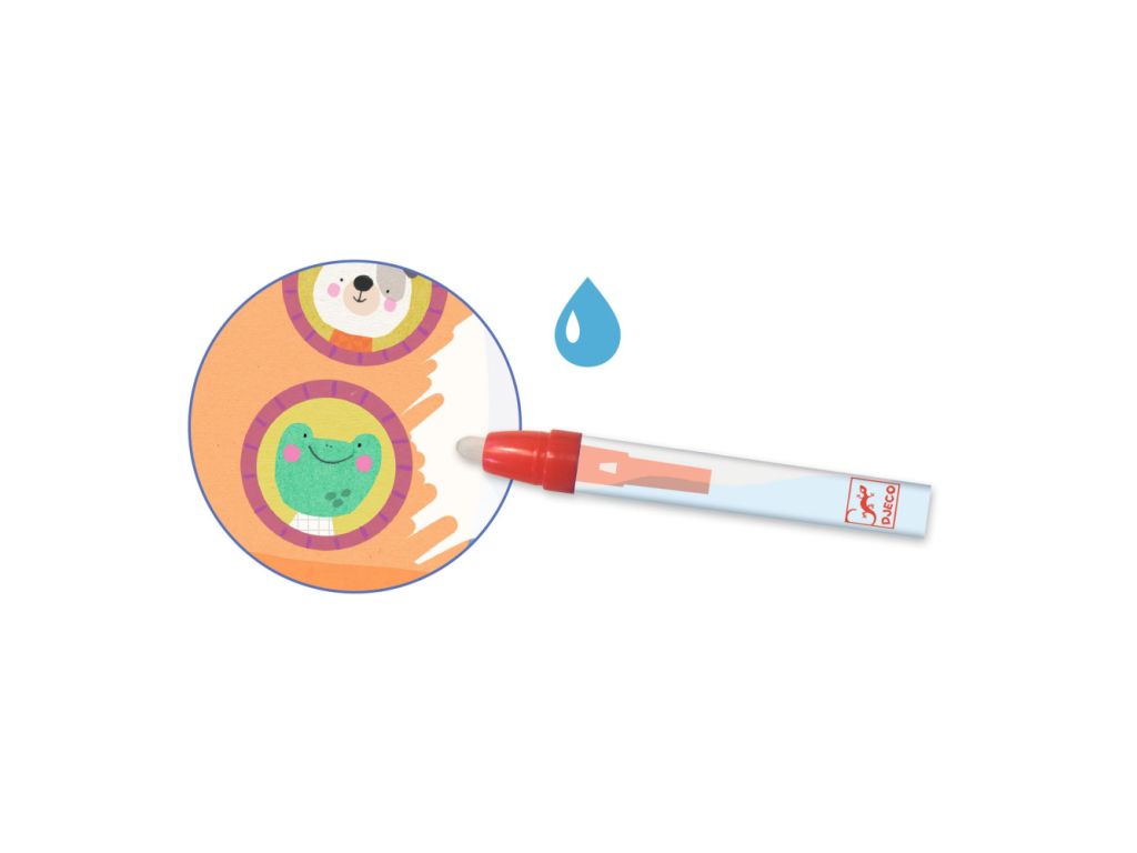 Opakovane použiteľná malá kreatívna sada od Djeco. Sada je vhodná pre deti už od 18 mesiacov. Obsahuje 4 obrázky z plastu a štetec so širokým filcovým hrotom a nádržkou na vodu.
