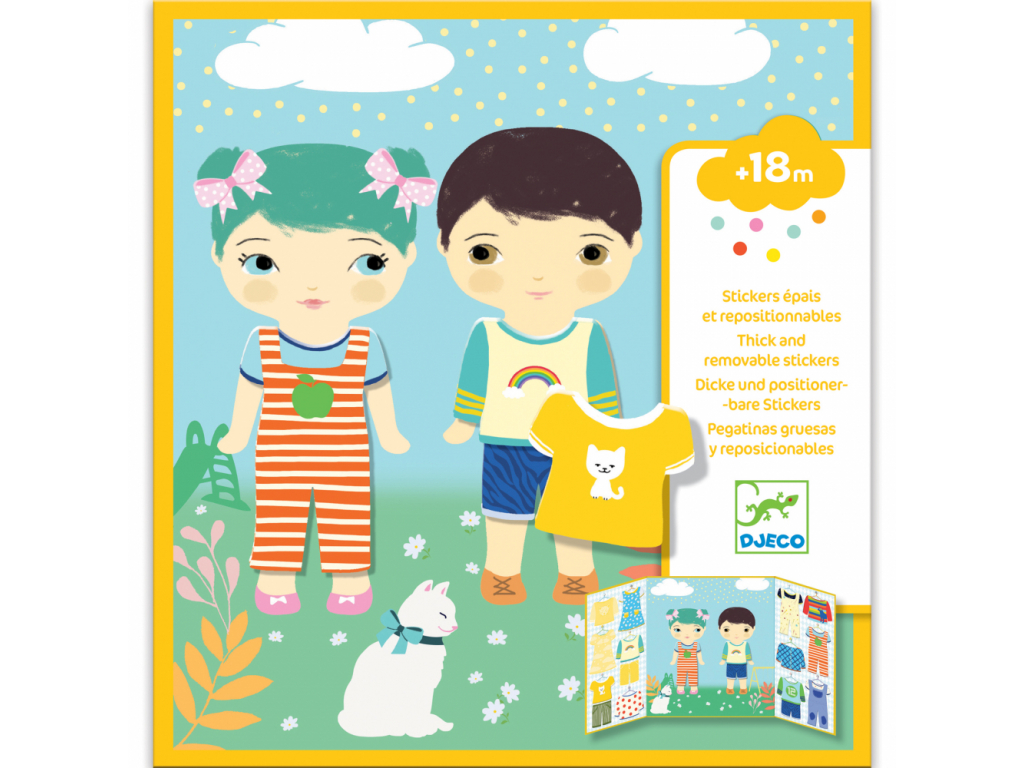 Znovuodlepiteľné samolepky a podložka s obrázkom obliekajúcich sa detí. Na deti nalepuj oblečenie! Malý kreatívny darček pre deti od 18 mesiacov.