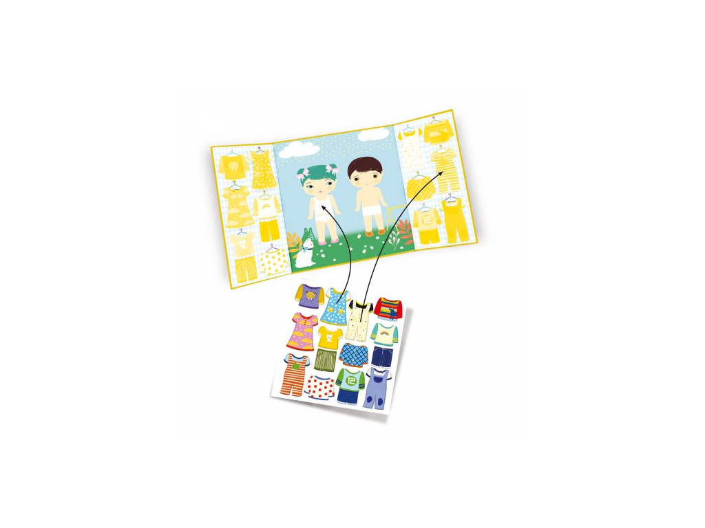 Hraj sa s obrázkami, stále znovu! Na podložku- deti nalepuj oblečenie a obliekaj ich! Podložka má na bokoch zatvárateľné strany, kde je miesto na odloženie samolepiek. Samolepky sú znovuodlepiteľné a môžeš ich pohodlne prelepovať. Zatvárateľná podložka je veľmi praktický formát na hranie a zároveň uschovanie samolepiek. Malý kreatívny darček pre drobcov.
