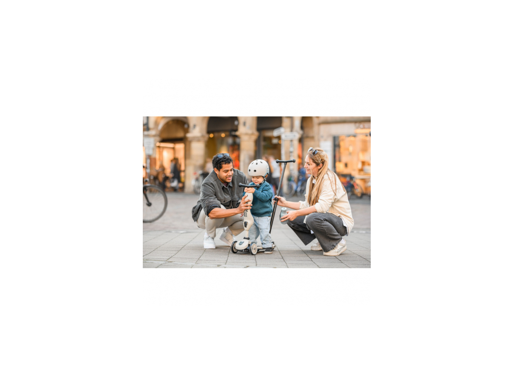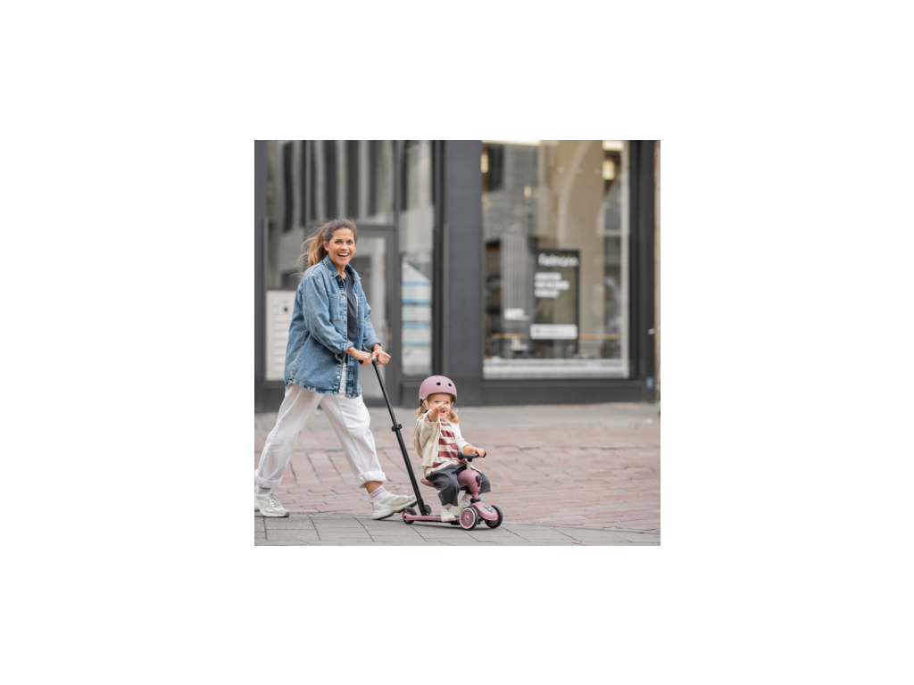 Teraz je možné pohodlne tlačiť deti vo veku 1 až 3 rokov, či už v sede alebo v stoji. Praktická tlačná tyč sa dá jednoducho upevniť na základňu kolobežky bez potreby náradia a je nastaviteľná v troch výškových úrovniach. Na základňu je možné pripojiť aj opierky na nohy, aby si deti mohli pri tlačení pohodlne odpočinúť.