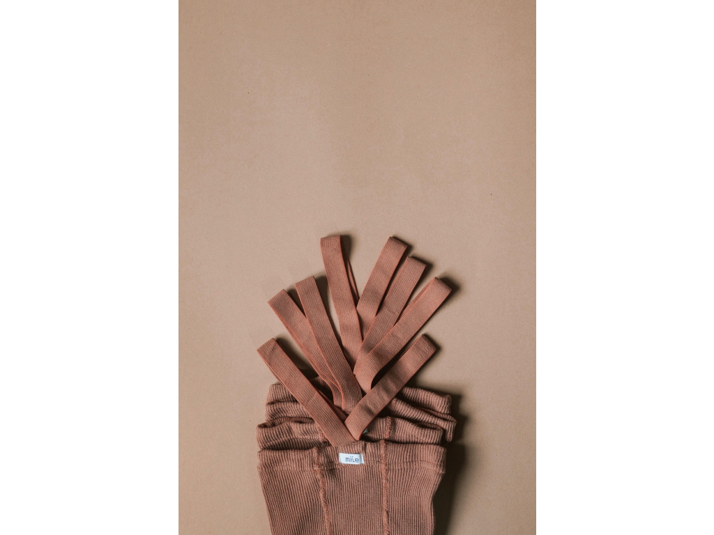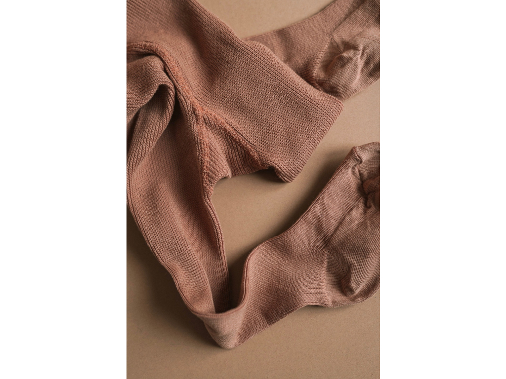 Jemné škoricové retro pančuchy MILE s elastickými trakmi, vhodné pre bábätká, lezúňov a detičky do 3 rokov. Vyrobené z česanej bavlny (85%) s jemným polyamidom (15%), vďaka ktorému držia tvar a neprederavia sa. Je vpletený medzi dve bavlnky, aby nedochádzalo ku kontaktu s detskou pokožkou. Preto sú vhodné aj pre ekzematickú pokožku.