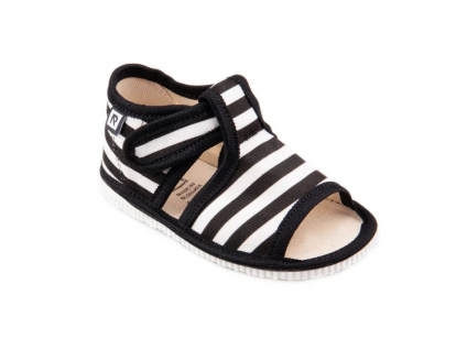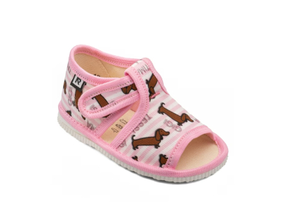 Detské papuče, sandálkového strihu s otvorenou špicou so zapínaním na “suchý zips “. Tvar špičky s dôrazom na typicky detský dominantný palček zabezpečuje dostatočný priestor pre prsty. Papučka je ľahká, pružná vyrobená z textilu ( zo 100% bavlny ), ktorý zabezpečuje priedušnosť a dokonalú prispôsobilosť tvaru nohy. Stielka papučky je v časti klenku vyplnená penovým materiálom, čo zabezpečuje dieťaťu pohodlnú chôdzu a podporuje zdravý vývoj nohy. Obuv je určená do interiéru ako prezuvková obuv. Má certifikát o zdravotnej a hygienickej nezávadnosti. Okrem toho bola posudzovaná komisiou zloženou z ortopéda, detského lekára, modelára a odborníkov na obuv, na základe čoho získala licenciu na používanie ochrannej známky ” Žirafa ” a ” Česká kvalita “.
