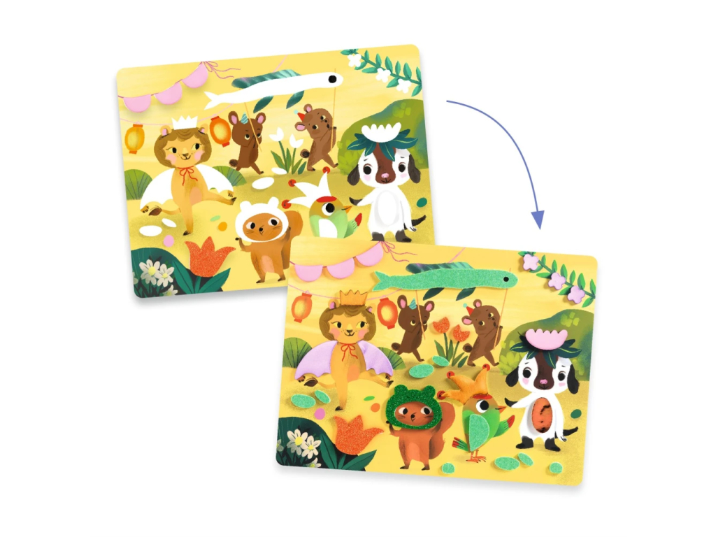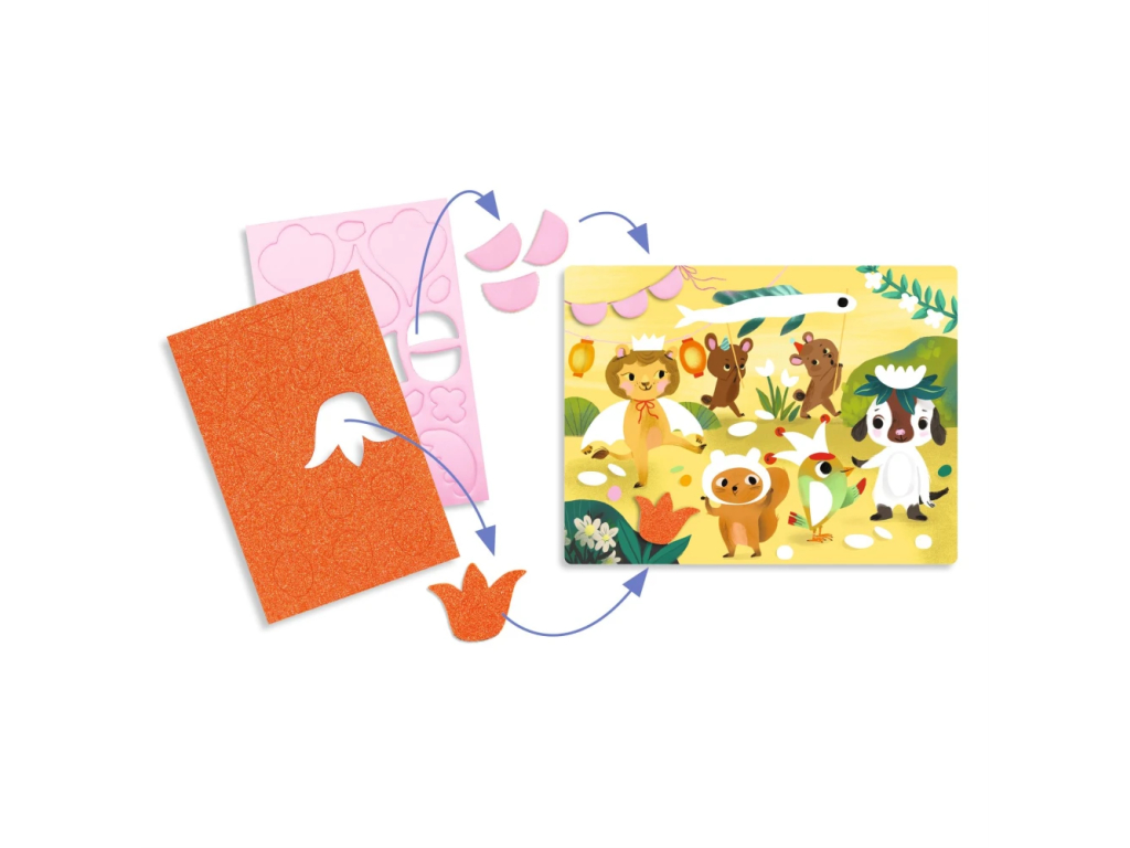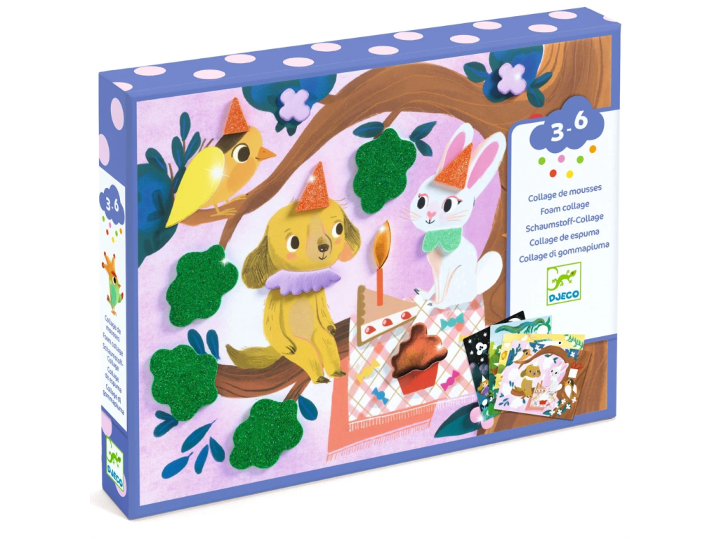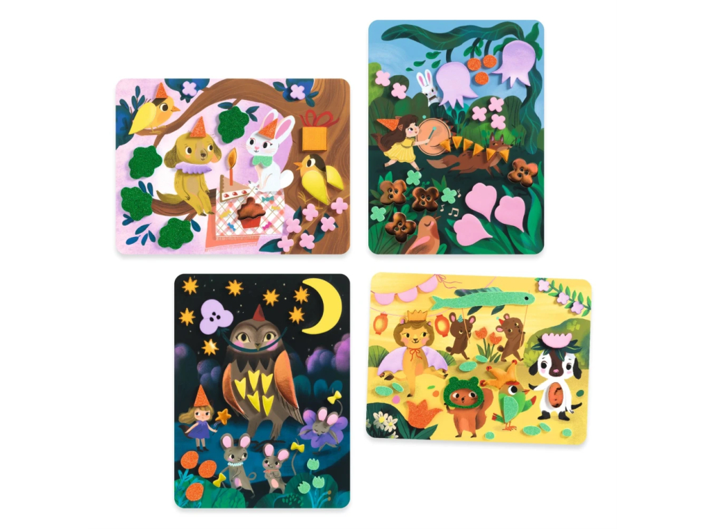 Penové koláže – Trblietavé oslavy sú kreatívna sada, v ktorej deti vytvoria 4 rozprávkovo slávnostné obrázky lepením metalických a trblietavých penových samolepiek.Je to hravá „mozaika“ bez farieb a bez neporiadku – dieťa len vyberá správne tvary a postupne dopĺňa scénu, až kým sa obrázok úplne nerozžiari.