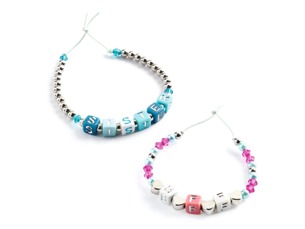 Sada korálok na bižutériu. Obsahuje 1000 kusov korálok a elastickú šnúrku na zhotovenie mnohých náramkov. Z kockových písmenkových korálok sa dajú vyskladať mená alebo slovíčka. Doplnené menšími farebnými a striebornými korálkami písmenká pekne vyniknú. Medzi menšími korálkami sú aj srdiečka. Farby sú zladené a každý šperk bude pekný. Dieťa navlieka korálky na elastickú šnúrku, ktorú zaviaže na uzlík. Pomôckou na navliekanie je šikovná ihla. Vďaka elastickej šnúrke sa dá náramok jednoducho zvliecť z ruky.