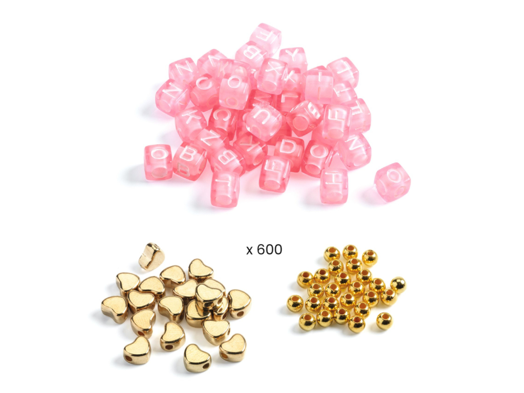 Sada korálok na bižutériu od Djeco. Obsahuje 1000 kusov korálok a elastickú šnúrku na zhotovenie mnohých náramkov. Z kockových písmenkových korálok sa dajú vyskladať mená alebo slovíčka. Doplnené menšími farebnými a zlatými korálkami písmenká pekne vyniknú. Obsahuje 2 ihly na navliekanie. S touto sadou vyrobíte skutočne veľa kreatívnych výrobkov.