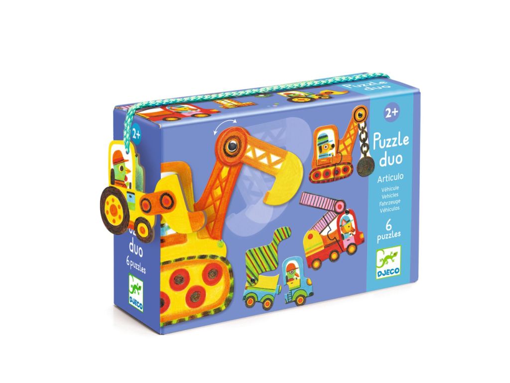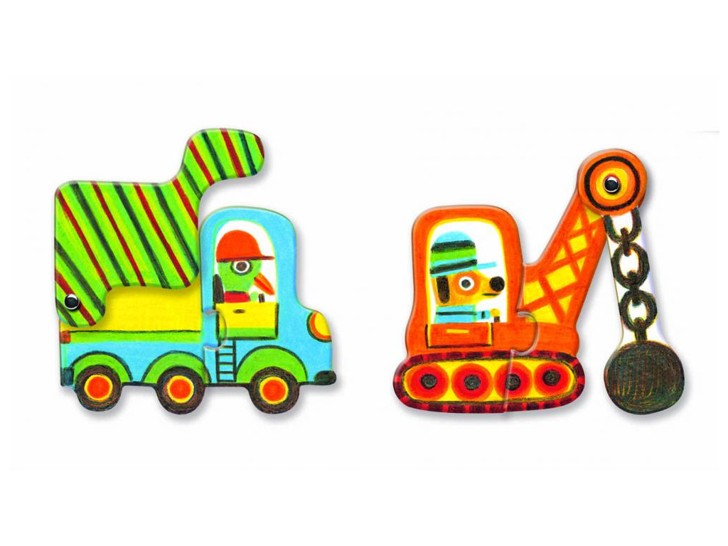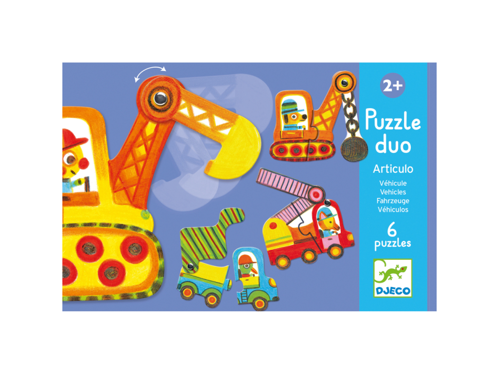 Edukačné puzzle od Djeco pre batoľatá. Sada 6 dvojdielnych siluetových puzzle, spolu 12 dielov. Dieťa poskladá farebné vozidlá so zvieracími vodičmi. Prekvapenie: nie sú to len obrázky, vozidlá majú pohyblivú časť! Rebríkom hasičského auta, alebo korbou nákladiaka sa dá hýbať.