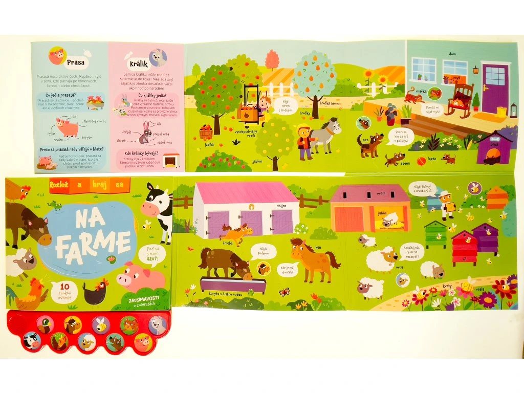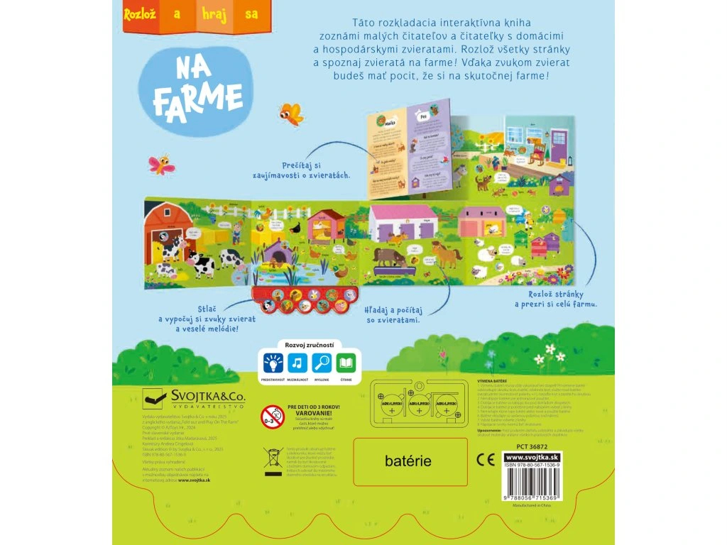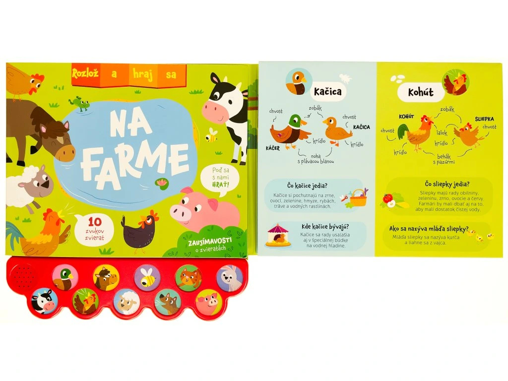 Rozlož knižku a prenes sa priamo na farmu plnú zvieratiek a zábavy! Rozlož a hraj sa – Na farme je interaktívne leporelo, ktoré deti vtiahne do života na vidieku a umožní im objavovať farmu hravou formou. Stačí rozložiť stránky a pred malými objaviteľmi sa otvorí pestrý svet domácich zvierat. Deti spoznajú kone, kravy, ošípané, včely a ďalších obyvateľov farmy, pričom môžu stláčať tlačidlá a počúvať autentické zvuky zvierat.