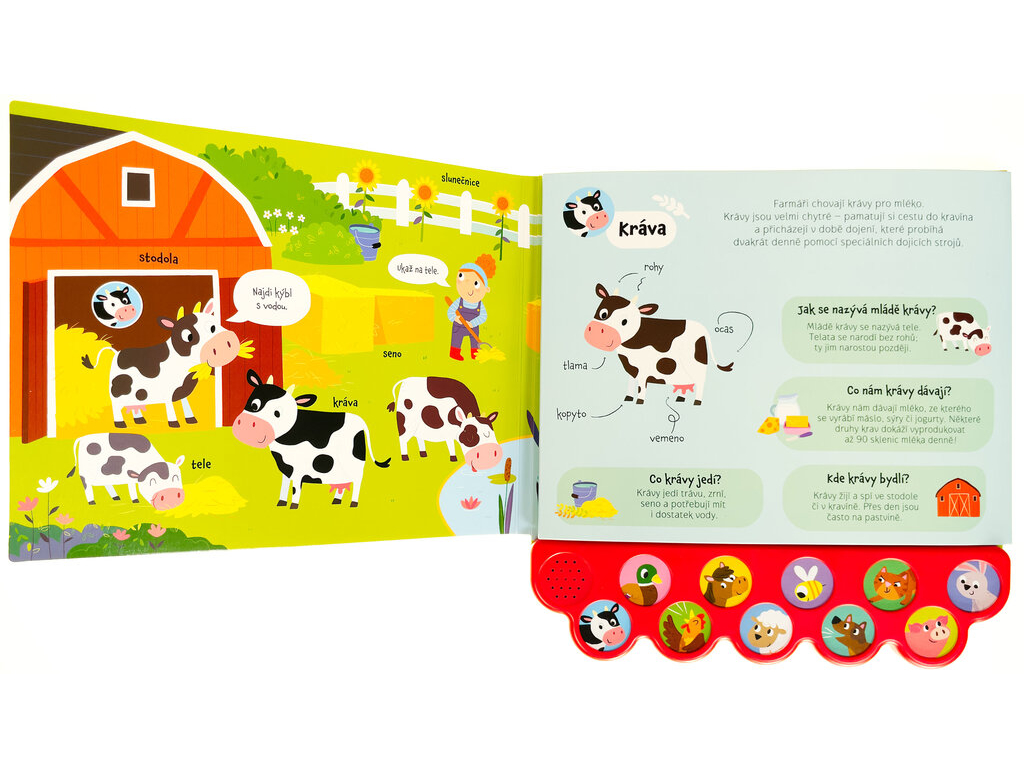 Stačí rozložiť stránky a pred malými objaviteľmi sa otvorí pestrý svet domácich zvierat. Deti spoznajú kone, kravy, ošípané, včely a ďalších obyvateľov farmy, pričom môžu stláčať tlačidlá a počúvať autentické zvuky zvierat aj veselé melódie. Bohaté ilustrácie a jednoduché aktivity na každej stránke motivujú deti hľadať, počítať a rozprávať vlastné príbehy z farmy. ()