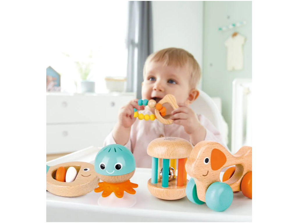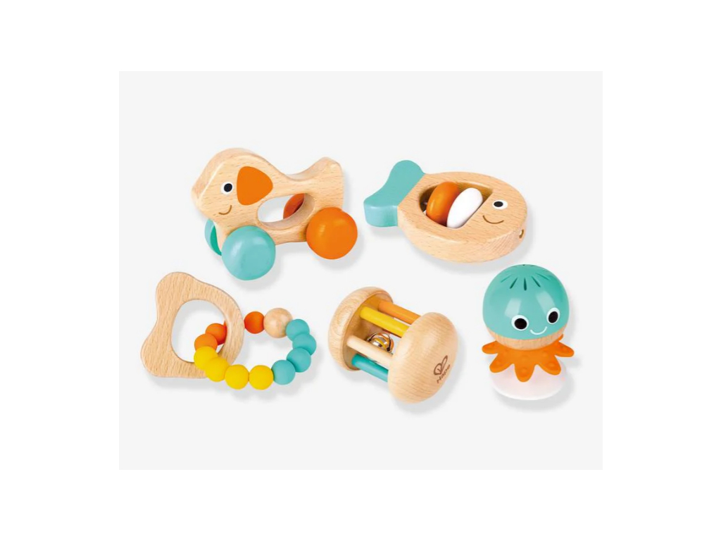 Krásna 5-dielna kolekcia prvých senzorických hračiek vyrobených z udržateľného bukového dreva môže rásť s najmenšími a podporuje ich zmyslový vývoj. Obsahuje jednu hrkálku v tvare rybky, jedno hryzátko s korálikmi, jednu hrkálku na statíve, jednu hrkálku na kolieskach a jedného psíka na kolieskach Všetko, čo drobec na prvé hry potrebuje: hrkálky, hryzátko, kolieska a pohyblivé prvky zakomponované v týchto jednoduchých hračkách.